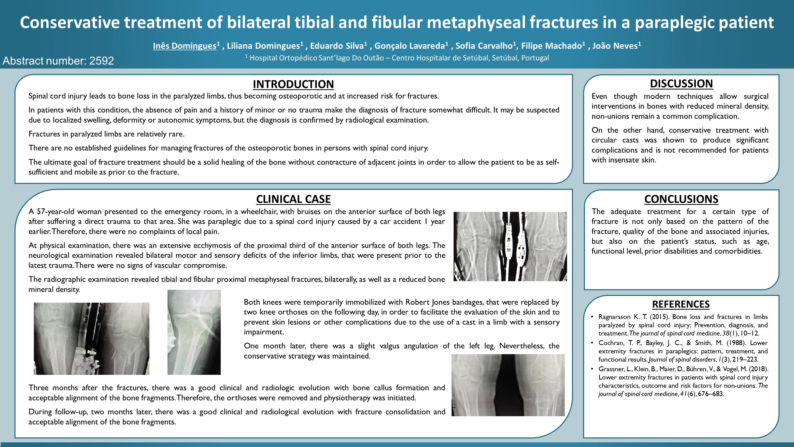 Case presentation: Woman, 57 years old, paraplegic due to a car accident 1 year earlier, presenting with bruises on the anterior surface of both legs after suffering a direct trauma to that area. The radiographic examination revealed tibial and fibular metaphyseal fractures, bilaterally, as well as a reduced bone mineral density. Both knees were immobilized with bandages temporarily, being replaced by knee orthosis on the following day, for better evaluation of the skin and to prevent skin lesions or other complications due to the use of a cast in a limb with a sensory impairment. The patient used the orthosis fulltime for 2 months, followed by intermittent use for 1 more month, according to the clinical and radiological evolution. Three months after the fracture, the orthosis was removed and physiotherapy was initiated. During follow-up, two months later, the patient has shown a good clinical and radiologic evolution with fracture consolidation and correct alignment of the bone fragments. Discussion: Even though modern techniques allow surgical interventions in bones with reduced mineral density, non-unions remain a common complication. The adequate treatment for a certain type of fracture is not only based on the pattern of the fracture, quality of the bone and associated injuries, but also on the patient’s status, such as age, functional level, prior disabilities and comorbidities.