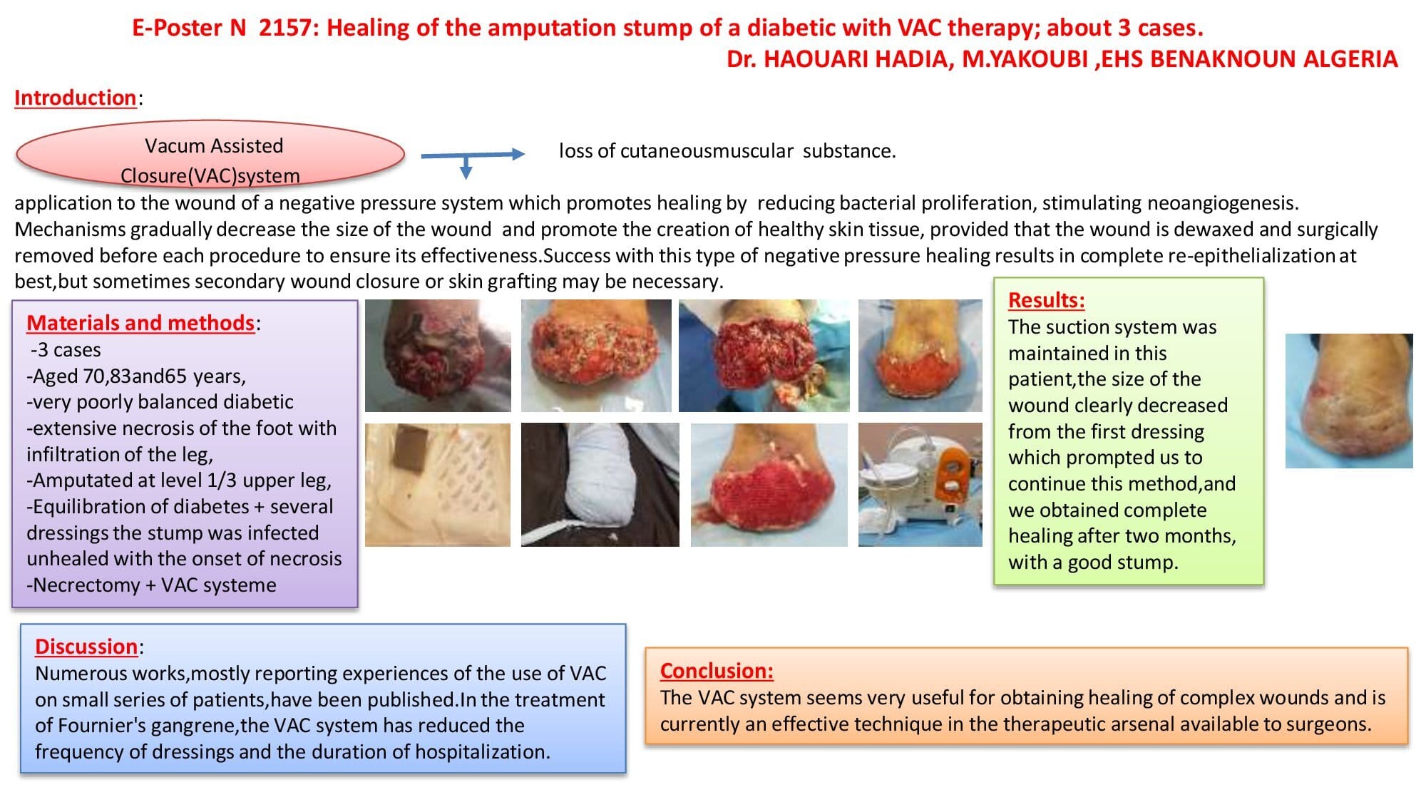Introduction:The Vacum Assisted Closure(VAC)system provides effective healing in extensive wounds with loss of cutaneousmuscular substance.Its principle is based on application to the wound of a negative pressure system which promotes healing by reducing bacterial proliferation, stimulating neoangiogenesis.These mechanisms gradually decrease the size of the wound and promote the creation of healthy skin tissue,provided that the wound is dewaxed and surgically removed before each procedure to ensure its effectiveness.Success with this type of negative pressure healing results in complete re-epithelialization at best,but sometimes secondary wound closure or skin grafting may be necessary.Materials and methods:We report an observation of 3 cases aged70,83and65 years,very poorly balanced diabetic who consulted at our level for extensive necrosis of the foot with infiltration of the leg,the patient was amputated at level 1/3 upper leg,after equilibration of diabetes and several dressings the stump was infected unhealed with the onset of necrosis,after necrectomy the VAC negative aspiration system was put in place. Results:The suction system was maintained in this patient,the size of the wound clearly decreased from the first dressing which prompted us to continue this method,and we obtained complete healing after two months, with a good stump.Discussion:Numerous works,mostly reporting experiences of the use of VAC on small series of patients,have been published.In the treatment of Fournier's gangrene,the VAC system has reduced the frequency of dressings and the duration of hospitalization. Conclusion:Considering its effectiveness,the VAC system seems very useful for obtaining healing of complex wounds and is currently an effective technique in the therapeutic arsenal available to surgeons.