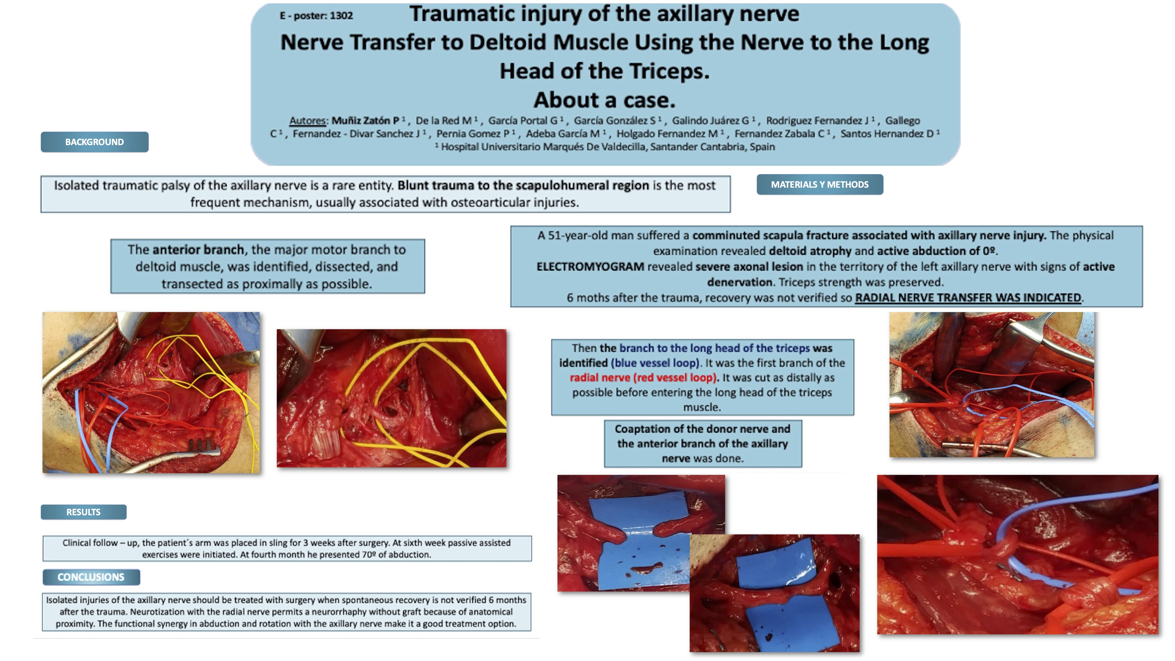 Introduction: isolated traumatic palsy of the axillary nerve is a rare entity. Blunt trauma to the scapulohumeral region is the most frequent mechanism, usually associated with osteoarticular injuries. Case presentation:A 51-year-old man suffered a comminuted scapula fracture associated with axillary nerve injury. The physical examination revealed deltoid atrophy and active abduction of 0º. Electromyogram revealed severe axonal lesion in the territory of the left axillary nerve with signs of active denervation. Triceps strength was preserved. 6 moths after the trauma, recovery was not verified so radial nerve transfer was indicated. The anterior branch, the major motor branch to deltoid muscle, was identified, dissected, and transected as proximally as possible. Then the branch to the long head of the triceps was identified. It was the first branch of the radial nerve. It was cut as distally as possible before entering the long head of the triceps muscle. Coaptation of the donor nerve and the anterior branch of the axillary nerve was done. Results: Clinical follow – up, the patient´s arm was placed in sling for 3 weeks after surgery. At sixth week passive assisted exercises were initiated. At fourth month he presented 70º of abduction. Discussion: Isolated injuries of the axillary nerve should be treated with surgery when spontaneous recovery is not verified 6 months after the trauma. Neurotization with the radial nerve permits a neurorrhaphy without graft because of anatomical proximity. The functional synergy in abduction and rotation with the axillary nerve make it a good treatment option.