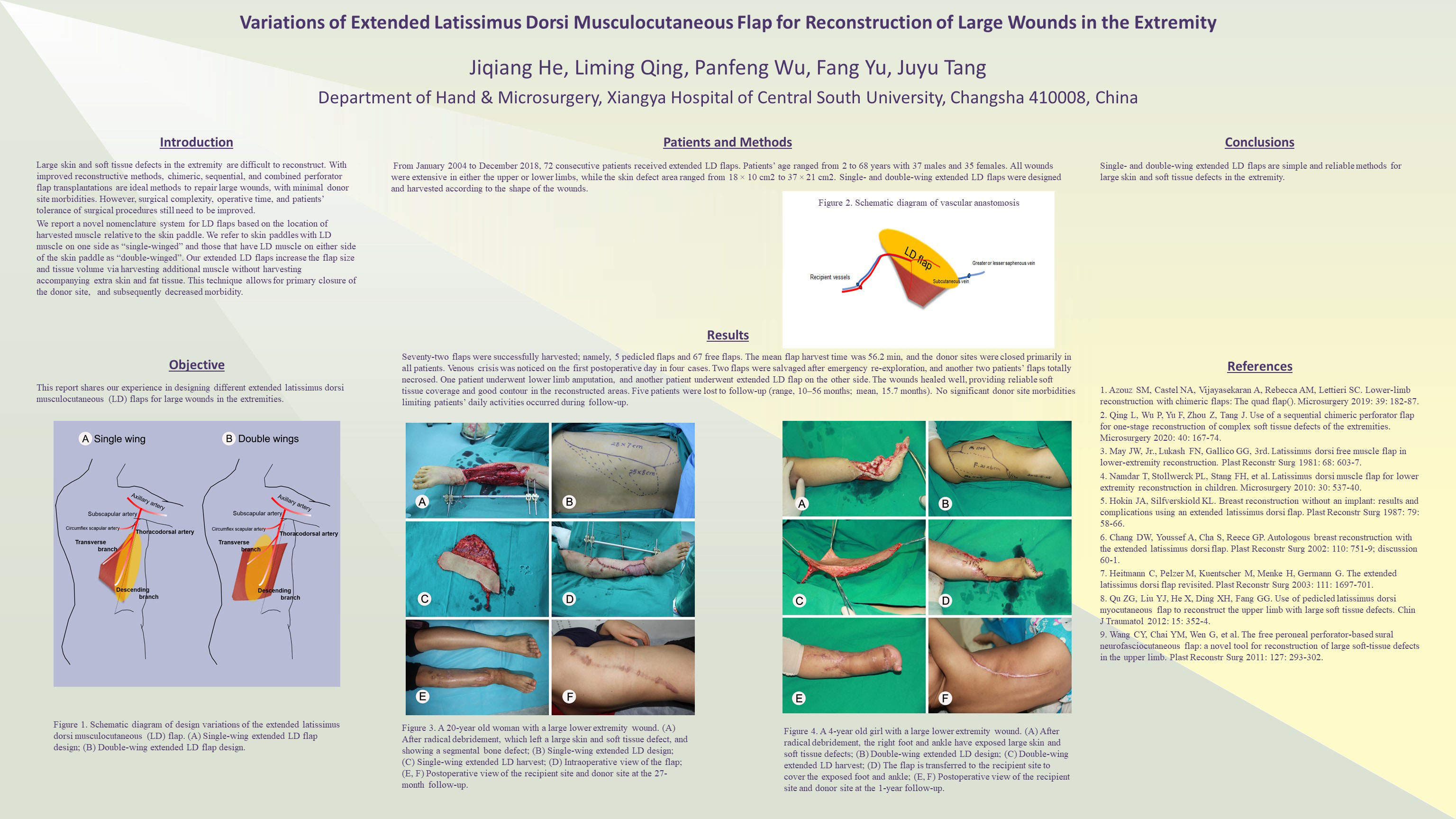 This report shares our experience in designing different extended latissimus dorsi musculocutaneous (LD) flaps for large wounds in the extremities. From January 2004 to December 2018, 72 consecutive patients received extended LD flaps. Patients’ age ranged from 2 to 68 years with 37 males and 35 females. All wounds were extensive in either the upper or lower limbs, while the skin defect area ranged from 18 × 10 cm2 to 37 × 21 cm2. Single- and double-wing extended LD flaps were designed and harvested according to the shape of the wounds. Seventy-two flaps were successfully harvested; namely, 5 pedicled flaps and 67 free flaps. The mean flap harvest time was 56.2 min, and the donor sites were closed primarily in all patients. Venous compromise was noticed on the first postoperative day in four cases. Two flaps were salvaged after emergency re-exploration, and another two patients’ flaps totally necrosed. One patient underwent lower limb amputation, and another patient underwent extended LD flap on the other side. The wounds healed well, providing reliable soft tissue coverage and good contour in the reconstructed areas. Five patients were lost to follow-up (range, 10–56 months; mean, 15.7 months). No significant donor site morbidities limiting patients’ daily activities occurred during follow-up. Single- and double-wing extended LD flaps are simple and reliable methods for large skin and soft tissue defects in the extremity.
