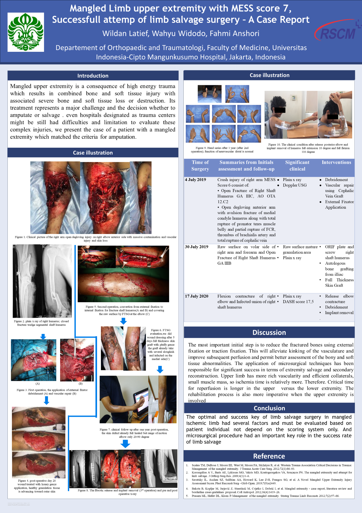 Introduction: The mangled limb is a term of an injury caused by major trauma and often combines significant injuries to the bone, skin, arteries, and nerves. criteria for amputation and salvage in mangled limbs still debatable. even hospitals as trauma centers still had difficulties evaluating mangled limbs. We present the case of a patient with a mangled limb upper extremity injury criteria amputation.