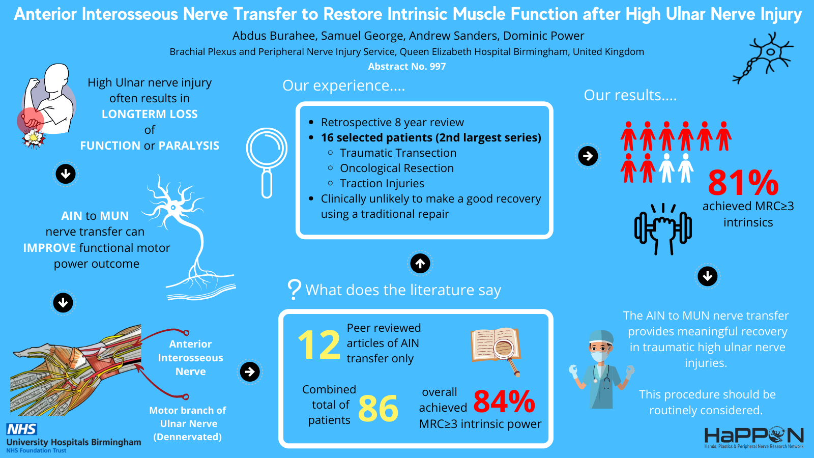 Conclusion: The AIN to MUN nerve transfer provides meaningful intrinsic recovery in the majority of traumatic high ulnar nerve injuries. This procedure should be routinely considered, however, warrants further research to validate the optimum technique.