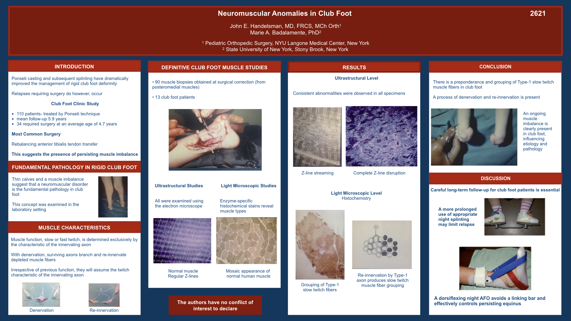 Introduction: Club foot management has been dramatically improved by Ponseti casting and subsequent splinting. Relapses requiring surgery do however, occur, as noted in the records of a Club Foot Clinic of 110 patients. Thirty Four needed surgery at an average age of 4.7 years. Most required a rebalancing anterior tibias tendon transfer. This indicates the presence of an ongoing neuromuscular imbalance. The typically thin calves in club foot suggest a muscle anomaly. Methods: Ninety muscle biopsies were obtained from the posterior and medial muscles during surgical correction of 13 club foot patients. All specimens were examined by electron microscope techniques. Enzyme specific stains were applied to 48 biopsies, which were then examined at the light microscopic level. Neuromuscular junctions were isolated and examined. Results: Consistent ultrastructural anomalies, Z-line streaming and complete disruption, occurred in all specimens. Histochemistry revealed a dominant Type 1 fiber population and grouping of Type 1 slow twich fibers. A correlated increase in Type 1 Neuromuscular junctions occurred in these areas. Fiber size alteration and inter-muscular fibrosis was present in some specimens. Conclusion: The function of a muscle, slow or fast twitch, is determined be the characteristic of the innervating nerve. The anomalies observed are well recognized as being neurologically determined. A neuromuscular abnormality is considered to be significant in the etiology and pathology of club foot. Long term follow-up and a more prolonged use of appropriate night splinting may limit relapse. A dorsiflexing night AFO, that avoids linking the feet, is effective in older children.