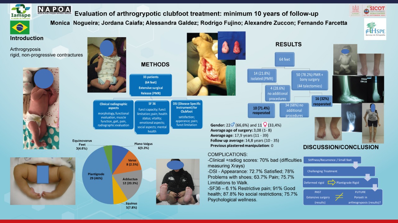 PURPOSE: To evaluate patients with arthrogryposis submitted to extensive surgical treatment with a minimum of 10 years of follow-up regarding the clinical and radiological aspects and the quality of life, using the 36-Item Short Form (SF-36) and the Disease-Specific Instrument (DSI). METHODS: A retrospective study was performed using the institution's surgical records, and 33 patients were selected, totalling 64 operated feet. RESULTS: The mean age of the patients was 17.9 years (12-39 years), and the mean follow-up time was 14.8 years (11-17). Amyoplasia represented 78.7% of syndromic diagnoses. Isolated posteromedial lateral release (PMLR) was performed in 21.8% of the feet, 27.2% of which required additional bone surgery, and about 50 feet (78.1%) were submitted to PMLR, lateral column shortening, and/or talectomy. In total, 46 talectomies were performed (71.8% of the feet), out of which 44 were the first procedure of choice. The responses to the SF-36 questionnaire were evaluated and showed that 93.9% of the patients did not have restrictive and disabling pain, and the same percentage considered themselves as healthy and had good expectations for the future. CONCLUSION: Arthrogrypotic feet are difficult to treat, require many recurrent surgical procedures, and relapses are the rule. Stiffness is a common feature of these feet, and residual deformities were frequent. Future studies will show whether there will be a difference in the outcome of the treatment of these feet by applying the current, more conservative initial approach.
