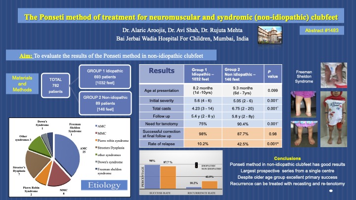 Purpose: To analyze the results of the Ponseti method in the treatment of non-idiopathic clubfeet and compare them with idiopathic clubfeet in a program-based setting using a standardized protocol. Methods: We reviewed two groups of 782 children treated prospectively in our Clubfoot Clinic: Group I comprising of 89 patients (146 feet) with non-idiopathic clubfoot and Group II comprising of 693 patients (1032 feet) with idiopathic clubfoot. Both groups were compared on basis of patient demographics, number of casts, tenotomy rate, success rate, rate of recurrences, and the need for additional secondary procedures. Results: Non-idiopathic clubfeet had a higher incidence of bilateral involvement (p=0.0093) and affected both males & females equally (p=0.002) as compared to idiopathic clubfeet. Non idiopathic clubfeet (Group I) required significantly more casts (6.75+4.2) compared to idiopathic clubfeet (4.23+4.14), had a higher rate of Achilles tenotomy (90.4% v/s 75%, p<0.0001), and a lower initial success rate compared to idiopathic clubfeet (92.5% v/s 100%, p<0.0001). There was a significant difference in the recurrence rates between the two groups as 42.5% of non-idiopathic feet (38 patients) relapsed as opposed to 10.2% (71 patients) in the idiopathic group (p<0.0001). Most recurrences in Group I were amenable to re-casting, with only nine patients (14 non-idiopathic clubfeet) requiring extensive soft-tissue releases. The final success rate in non-idiopathic group at a mean follow-up of 5.8 years (2 – 8 years) was 87.7%. Conclusions: We recommend the use of the Ponseti method as an effective treatment for non-idiopathic clubfeet associated with neuromuscular and syndromic conditions.