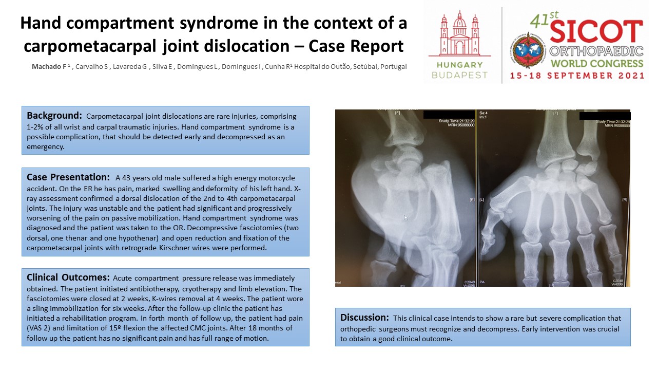 Case Presentation: A 43 years old male suffered a high energy motorcycle accident. On the ER he has pain, marked swelling and deformity of his left hand. X-ray assessment confirmed a dorsal dislocation of the 2nd to 4th carpometacarpal joints. The injury was unstable and the patient had significant and progressively worsening of the pain on passive mobilization. Hand compartment syndrome was diagnosed and the patient was taken to the OR. Decompressive fasciotomies (two dorsal, one thenar and one hypothenar) and open reduction and fixation of the carpometacarpal joints with retrograde Kirschner wires were performed.