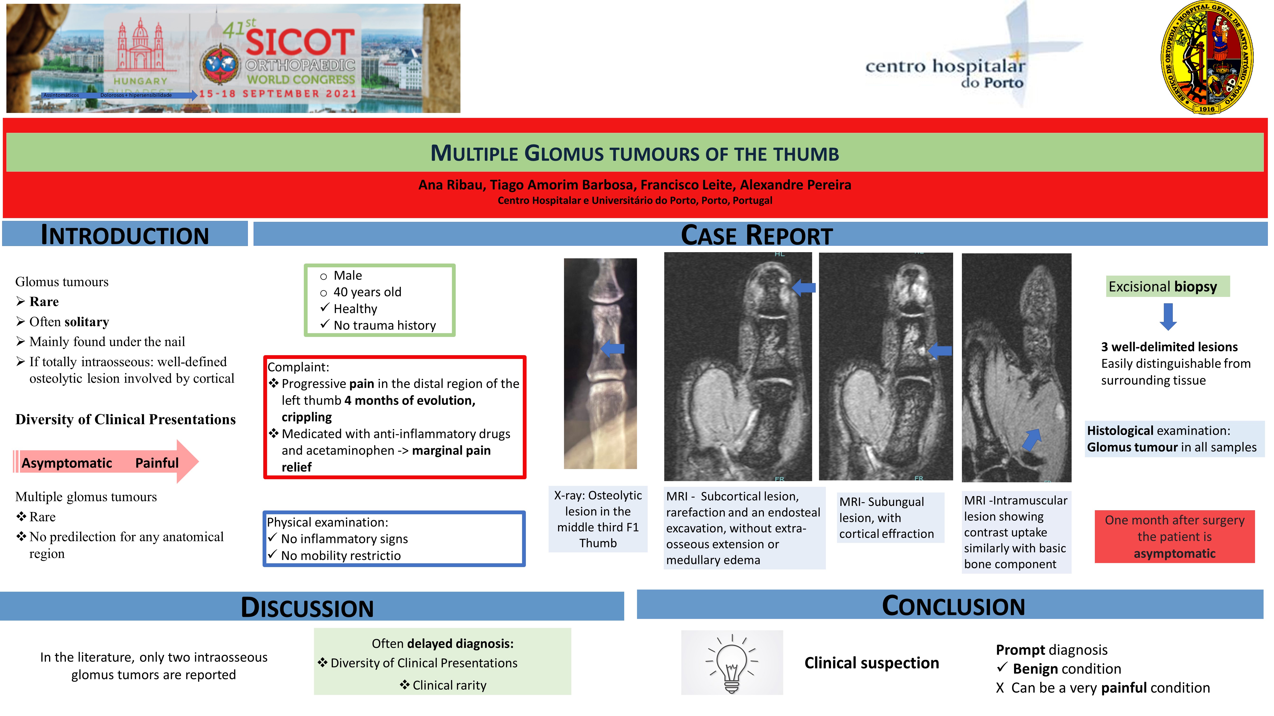 Glomus tumors are rare lesions, most often solitary and with a predilection for the subungual located. The clinical presentation is diverse, from asymptomatic to, more often, painful and hypersensitive to cold. Multiple glomus tumors are a very rare entity. We present a case of multiple painful glomus tumors, in the same radius of the hand. A 40-year-old healthy man presented at the consultation complaining of progressive pain in the distal left thumb, with 4 months of evolution, without history of trauma. The pain was disabling. He had previously been treated with anti-inflammatories with marginal relief. The objective examination showed no inflammatory signs and no limitation of mobility. Radiography revealed a circumscribed osteolytic lesion in the proximal phalanx. Magnetic resonance imaging showed a subcortical lesion, conditioning a rarefaction and an endosteal excavation of the radial cortex, without significant extra-bony extension. In the distal phalanx of the thumb, another subungual lesion is observed, with cortical efraction. In the thenar eminence, another intramuscular lesion is observed, evidencing uptake of contrast in a similar way of other lesions. An excisional biopsy was performed. Intraoperatively, 3 well-defined lesions were found, easily distinguishable from the surrounding tissue, compatible. Histological examination showed a glomus tumor in all samples. One month after surgery, the patient is asymptomatic. The recognition and treatment of these injuries quickly is essential, since despite their benign nature, these injuries can be the cause of pain that is difficult to control.