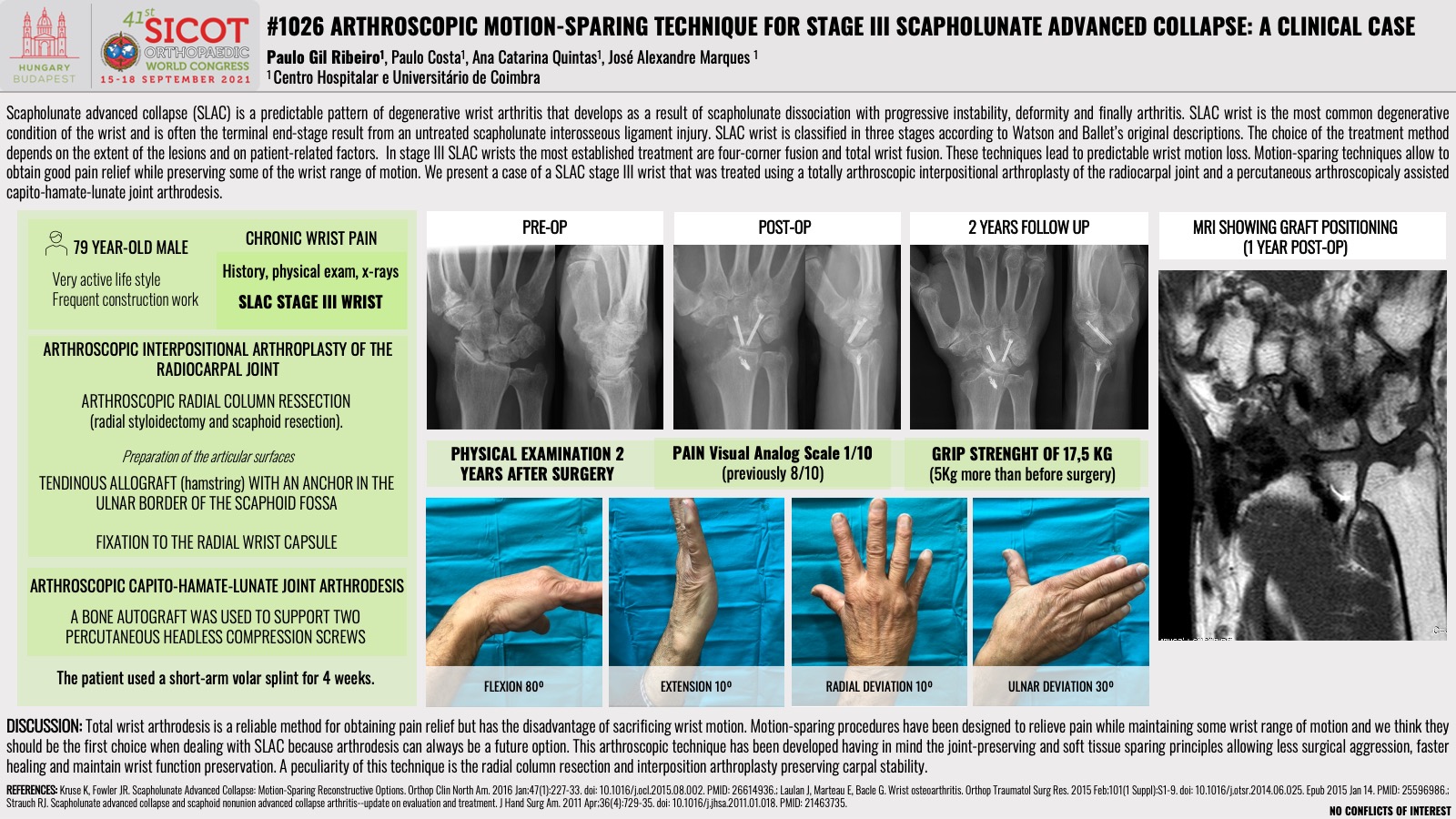 Background: Scapholunate advanced collapse (SLAC) is a pattern of degenerative wrist arthritis that develops as a result of scapholunate dissociation with progressive instability, deformity and finally arthritis. In stage III SLAC wrists the most established treatment are four-corner fusion and total wrist fusion. These techniques lead to predictable wrist motion loss. Motion-sparing techniques allow to obtain good pain relief while preserving some of the wrist range of motion. Case Presentation: We present a clinical case of a 79-year-old male diagnosed with a SLAC stage III wrist. The patient was submitted to an arthroscopic interpositional arthroplasty of the radiocarpal joint and arthroscopic capito-hamate-lunate joint arthrodesis. We did an arthroscopic radial column ressection and after preparing the articular surfaces we applied a tendinous allograft with an anchor in the ulnar border of the scaphoid fossa and fixed to the radial wrist capsule. Then we used bone autograft to support two percutaneous headless compression screws in an arthroscopic capito-hamate-lunate arthrodesis. Clinical Outcomes: Two years after surgery the patient is extremely satisfied with the results having returned to his construction work. He now has a pain visual analog scale of 1/10 (8/10 before surgery) and a grip strenght of 17,5 Kg (5Kg more than before surgery). He presents a wrist flexion of 80º, 10º of extension, radial deviation of 20º and ulnar deviation of 30º. Discussion: This arthroscopic technique has been developed having in mind the joint-preserving and soft tissue sparing principles allowing less surgical aggression, faster healing and maintain wrist function preservation.