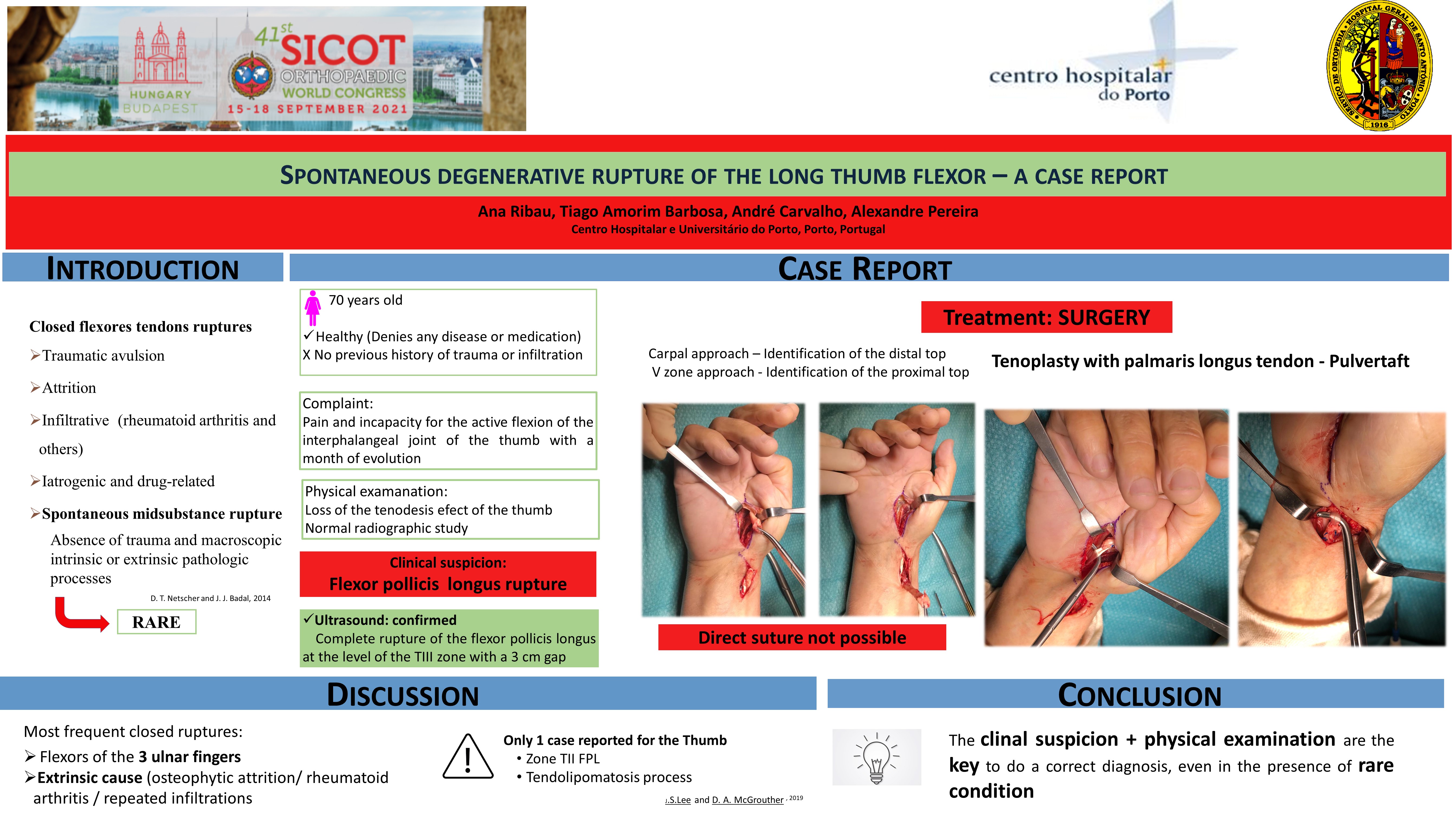 The closed rupture of the tendons of the hand is caused by traumatic avulsion, middle substance rupture, rupture by attrition, rheumatoid arthritis or other chronic infiltrative conditions and iatrogeny (related to medications/infiltrations). We present a case of spontaneous rupture of the long flexor tendon of the thumb, with no apparent extrinsic cause, treated surgically. A 70-year-old woman consults her orthopedics due to pain and incapacity for active flexion of thumb interphalangeal, with a month of evolution. The examination reveals a loss of the tenodesis grasp of the thumb. She denies relevant antecedents, namely inflammatory disease. No previous history of trauma or infiltration. The radiographic study did not reveal any changes in the bones or joints of the hand / wrist. The ultrasound study confirmed complete rupture of the long flexor pollicis at the level of the TIII zone with a tendinous gap of 3 cm. A carpal approach extending to the TIII zone were pweformed with identification of the distal top of the tendon. An incision was made at the level of zone V for exploration and the proximal top was identified. Degenerative tendon rupture was verified, with no possibility of direct suture. Tenoplasties were performed with long palmar and Pulvertaft sutures. Spontaneous ruptures of the tendon of the long flexor pollicis are rare and when they occur it is mostly due to an extrinsic cause. Rupture due to intrinsic id only reported in the literature in one caset, attributed to a tendolipomatosis process, which makes this case unique.