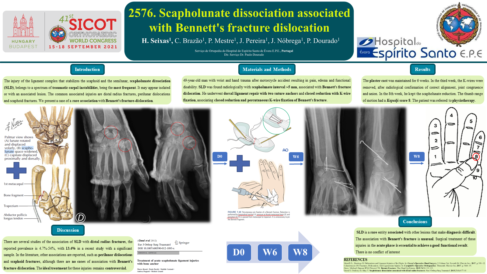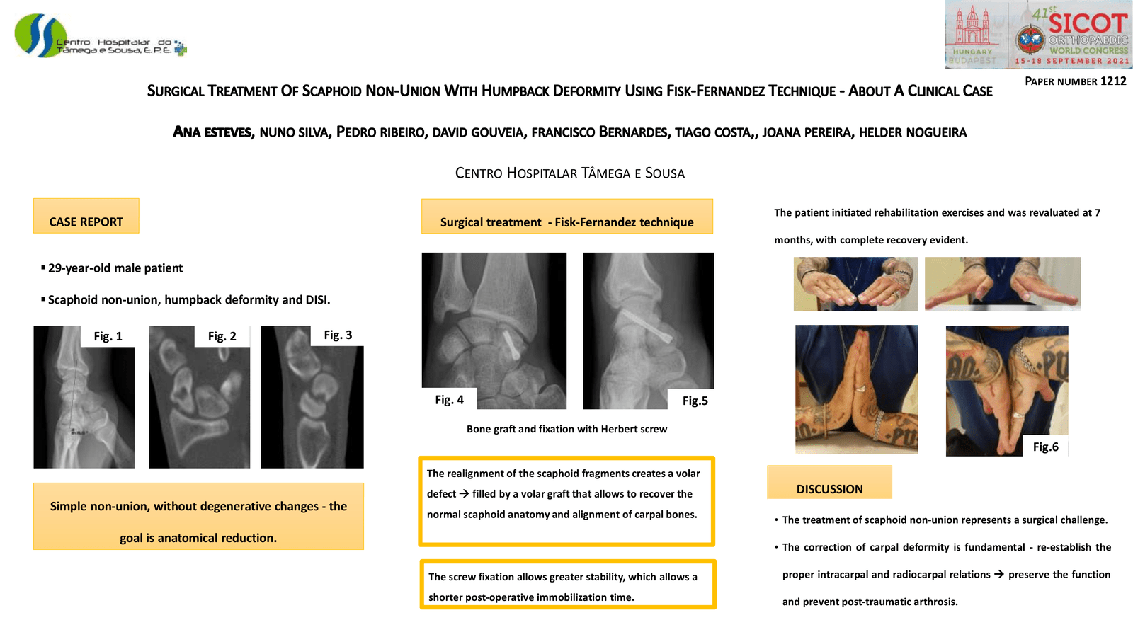 The incidence of scaphoid non-union is 5-15%. The treatment of this condition represents a surgical challenge - the surgical strategy is to re-establish the coronal alignment of the scaphoid and the carpal homeostasis. The authors present a case of a 29-year-old male with scaphoid non-union, accompanied by carpal instability with humpback deformity and DISI. Surgical treatment was chosen, according to the Fisk-Fernandez technique. Simple non-union, without degenerative changes, as shown in this case, the goal is anatomical reduction; when there are degenerative changes, treatment is palliative (arthrodesis, arthroplasty). There are several surgical techniques, namely Matti-Russe, Fisk-Fernandez, use of vascularized graft, etc. In this case, the Fisk-Fernandez technique was used – using bone graft and fixation with Herbert screw - with an advantage over Matti- Russe technique - it can be used in patients with humpback deformity and allows early mobilization. The realignment of the scaphoid fragments creates a volar defect, which is filled by a volar graft that allows to recover not only the normal scaphoid anatomy but also the alignment of carpal bones. The screw fixation allows greater stability, which allows a shorter post-operative immobilization time. The patient initiated rehabilitation exercises and was revaluated at 7 months, with complete recovery evident. This entity offers surgical challenges because the correction of carpal deformity is fundamental – is important to re-establish the proper intracarpal and radiocarpal relations, in order to preserve the function and prevent post-traumatic arthrosis. This option ensured a good functional and radiological result.