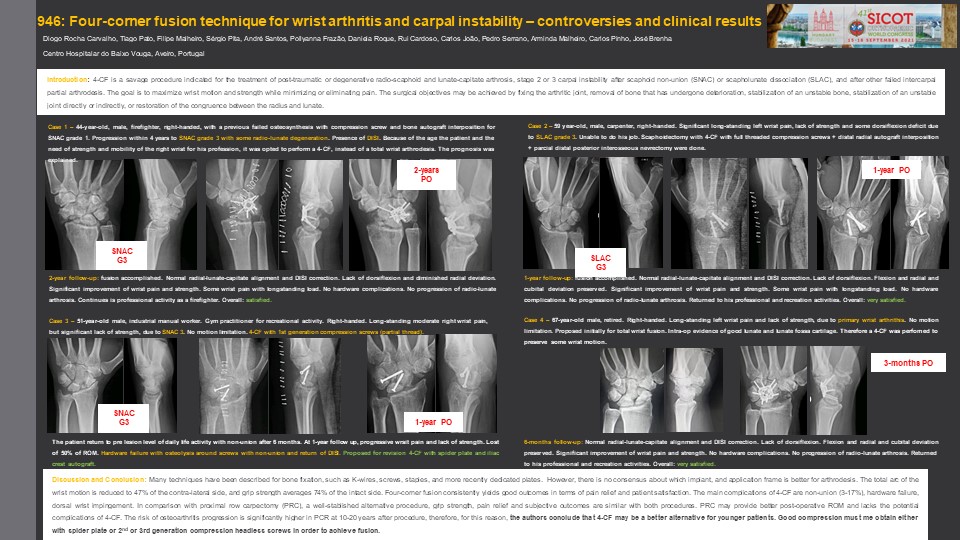 Introduction: ‘Four-corner’ fusion (4-CF) is the most common intercarpal arthrodesis. The main indications for 4-CF are post-traumatic or degenerative radio-scaphoid and luno-capitate arthrosis, stage 2 or 3 carpal instability after scaphoid non-union (SNAC) or scapholunate dissociation (SLAC) and other failed intercarpal partial arthrodesis.