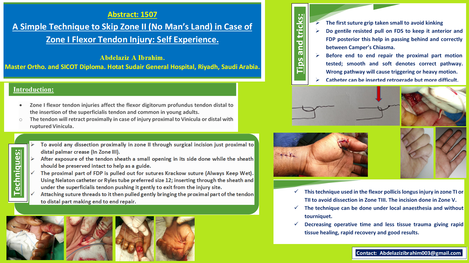 Zone I flexor tendon injuries affect the flexor digitorum profundus tendon distal to the insertion of the superficialis tendon and common in young adults. The tendon will retract proximally in case of injury proximal to vinicula or distal but ruptured. To avoid any dissection proximally in zone II by opening an incision just proximal to distal palmar crease (In Zone III). Small opening in side of the sheath and must be kept intact to be as a guide. The proximal part of is pulled out for sutures Krackow suture. Usning Nelaton catheter or Ryles tube prefered size 12; inserting through the sheath and under the superficialis tendon pushing it gently to exit from the injury site. Attaching suture threads to it then pulled gently bringing the proximal part of the tendon to distal part making end to end repair. Tips and tricks: Small stitch grip to avoid kinking, making gentile pull on FDS to help passing below and correctly between Camper’s Chiasma. Before end to end repair the proximal part motion tested; smooth and soft denotes correct pathway. Wrong pathway will cause triggering or heavy motion. Catheter can be inserted retrograde but more difficult. This technique used in the flexor pollicis longus injury in zone TI or TII to avoid dissection in Zone TIII. The incision done in Zone V. The technique can be done under local anaesthesia and without tourniquet. Decreasing operative time and less tissue trauma giving rapid tissue healing, rapid recovery and good results.