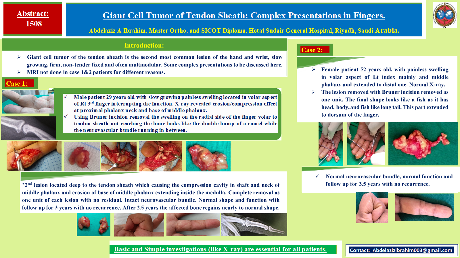 Giant cell tumor of the tendon sheath is the second most common lesion of the hand and wrist, slow growing, firm, non tender fixed and often multi nodular. I face some complex presentations as follow: 1- Male patient 29 years old with slow growing swelling non tender in volar aspect of Rt 3rd finger interrupting the function. X-ray revealed compression effect at proximal phalanx neck and base of middle phalanx. Using Bruner incision removal the swelling on the radial side of the finger volar to tendon sheath not reaching the bone looks like the double hump of a camel where the neurovascular bundle passing in between. There is another lesion located deep to the tendon sheath which causing the compression cavity in shaft and neck of middle phalanx and erosion of base of middle phalanx extending inside the medulla. Complete removal as one unit of each lesion with no residual. Intact neurovascular bundle. Normal shape and function with follow up for 3 years with no recurrence. MRI not done for both patients for different reasons. 2- Female patient 52 years old, with painless swelling in volar aspect of lt index mainly and middle phalanx and extended to distal one. Normal X-ray. The lesion removed with Bruner incision removed as one unit. The final shape looks like a fish as it has head, body and fish like long tail. This part extended to dorsum of the finger. Intact neurovascular bundle, normal function and follow up for 3.5 years with no recurrence.