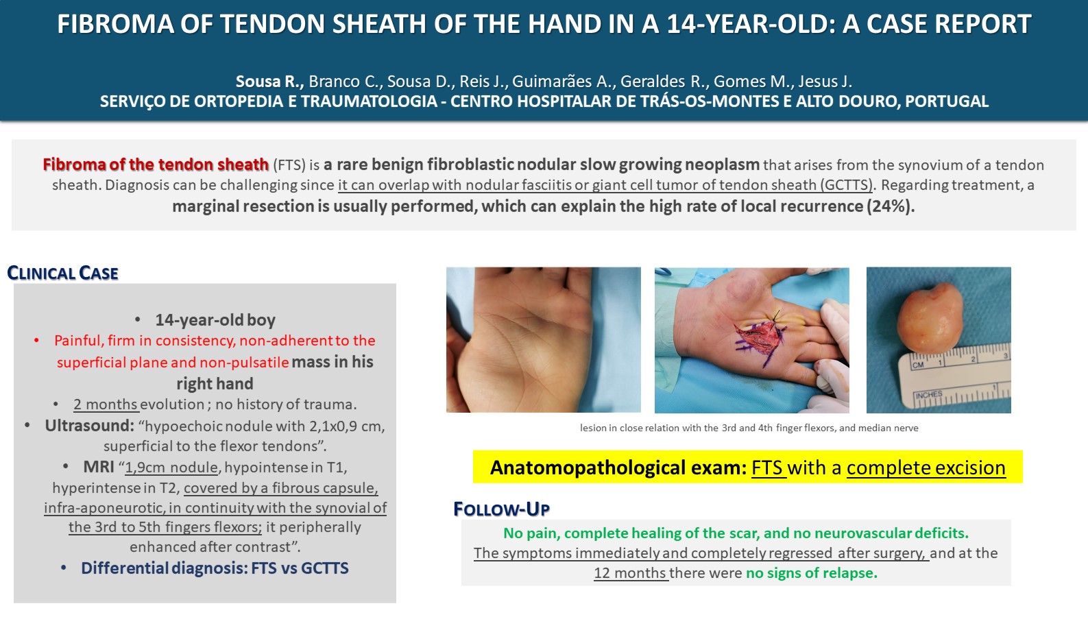 Fibroma of the tendon sheath (FTS) is a rare benign fibroblastic nodular slow growing neoplasm that arises from the synovium of a tendon sheath. Diagnosis can be challenging since it can overlap with nodular fasciitis or giant cell tumor of tendon sheath (GCTTS). Regarding treatment, a marginal resection is usually performed, which can explain the high rate of local recurrence (24%). The authors present a clinical case of a 14 years-old boy. Otherwise healthy, he presented with complains of a painful, firm in consistency, non-adherent to the superficial plane and non-pulsatile mass in his right hand, with 2 months evolution and no history of trauma. Ultrasound revealed a “hypoechoic nodule with 2,1x0,9 cm, superficial to the flexor tendons”. MRI was ordered and showed “1,9cm nodule, hypointense in T1, hyperintense in T2, covered by a fibrous capsule, infra-aponeurotic, in continuity with the synovial of the 3rd to 5th fingers flexors; it peripherally enhanced after contrast”. Differential diagnosis considered FTS and GCTTS and surgery was proposed. The lesion was in closed relation with the 3rd and 4th finger flexors, and median nerve. A careful dissection was performed, and the mass sent to anatomopathological exam. Surgery and the p period were uneventful wich was compatible with the diagnosis of FTS and with a complete excision. On the follow-up appointments the patient presented with no pain, complete healing of the scar, and no neurovascular deficits. The symptoms immediately and completely regressed after surgery, and at the 12 months there were no signs of relapse.