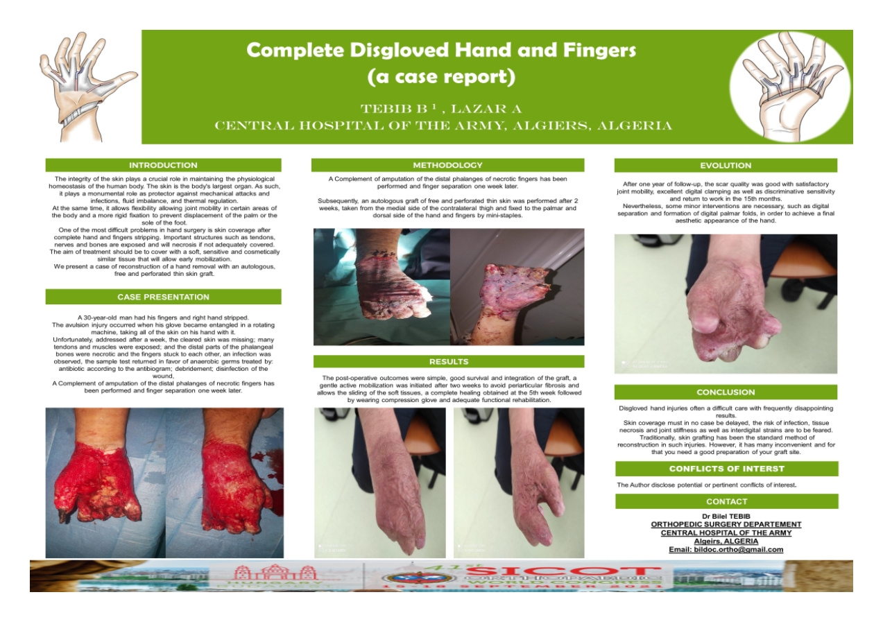 Materials and methods: After a work accident (industrial machine), a case of complete skin disgloved hand and fingers is reported in a 28-year-old man. arrived 5 days after his accident with an over-infected wound and fingers stuck to each other, first goals were: disinfection of the wound and separation of the fingers then an autologus graft of thin skin surfacing.