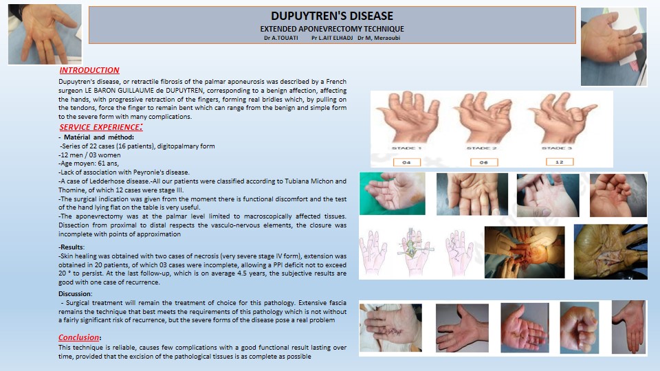Materials and methods: We report a series of 12 cases (10 patients) of Dupuytren's disease in its digitopalmar form (7 men, 03 women), the mean age was at 61 years, we note the absence of association with a Peyronie's disease. On the other hand we find a case of Ledderhose disease. All our patients were classified according to Tubiana Michon and Thomine, of which 10 cases were stage III. The surgical indication was made from the moment there was functional discomfort and the test of the hand lying flat on the table is very useful. Palmar fascia was limited to macroscopically affected tissues. Dissection from proximal to distal respects the vasculo-nervous elements, the closure was incomplete with points of approximation.