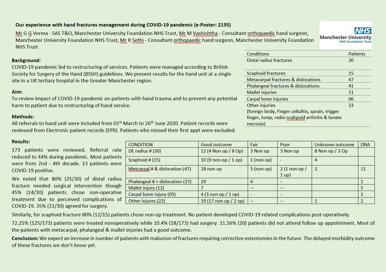 Background: We present results for the hand unit during COVID-19 pandemic at a single site in a UK tertiary hospital in the Greater Manchester region. Methods: Patients records were reviewed 01st March to 26th June 2020. All patients referred for treatment during this period were included. Patients who missed their first referral appointment were excluded. Results: 173 patients were reviewed. Referral rate reduced to 44% during pandemic. Most patients with injuries were from 2nd - 4th decade. There were 30 distal radius fractures, 47 metacarpal fractures, 41 phalangeal fractures, 15 scaphoid fractures, 11 mallet fingers injuries, 6 carpal bone injuries and 23 other conditions. 13 patients were COVID-19 positive. We noted huge variation in practice as 25 (80%) of distal radius fracture needed surgical intervention though 14 (45%) patients chose non-operative treatment due to perceived complications of COVID-19. 11 (35%) agreed for surgery. Similarly, for scaphoid fracture 12 (80%) patients chose non-op treatment when COVID-19 complications were discussed. No patient developed COVID-19 related complications post-operatively. Possibly because they were all day cases and young. 125/173 patients were treated with nonoperatively while 18/173 had surgery. 20 patients did not attend follow up appointment. Most of the patients with metacarpal, phalangeal and mallet injuries had a good outcome. Detailed outcomes of these and other injuries will be presented in the meeting. Conclusion: We expect an increase in number of patients with malunion of fractures requiring corrective osteotomies in the future. The delayed morbidity outcome of these fractures we don’t know yet.