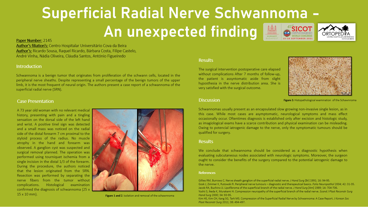 Schwannoma is a benign tumor that originates from proliferation of the schwann cells, located in the peripheral nerve sheaths. Despite representing a small percentage of the benign tumors of the upper limb, it is the most frequent of neural origin. The authors present a case report of a schwannoma of the superficial radial nerve (SRN). A 73 year old woman with no relevant medical history, presenting with pain and a tingling sensation on the dorsal side of the left hand and wrist. A positive tinel sign was detected and a small mass was noticed on the radial side of the distal forearm. A ganglion cyst was suspected and surgical removal planned. During the procedure, the authors noticed that the lesion originated from the SRN. Resection was performed by separating the nerve fibers from the tumor without complications. Histological examination confirmed the diagnosis of schwannoma. After 7 months of follow-up, the patient has no symptoms besides hyposthesia in the nerve distribution area. Schwannomas usually present as an encapsulated slow growing non-invasive single lesion. While most cases are asymptomatic, neurological symptoms and mass effect occasionally occur. Oftentimes diagnosis is established only after excision and histologic study, as imagiological exams have a scarce contribution and physical examination can be misleading. We conclude that schwannoma should be considered as a diagnostic hypothesis when evaluating subcutaneous nodes associated with neurologic symptoms. Moreover, the surgeon ought to consider the benefits of the surgery compared to the potential iatrogenic damage to the nerve.