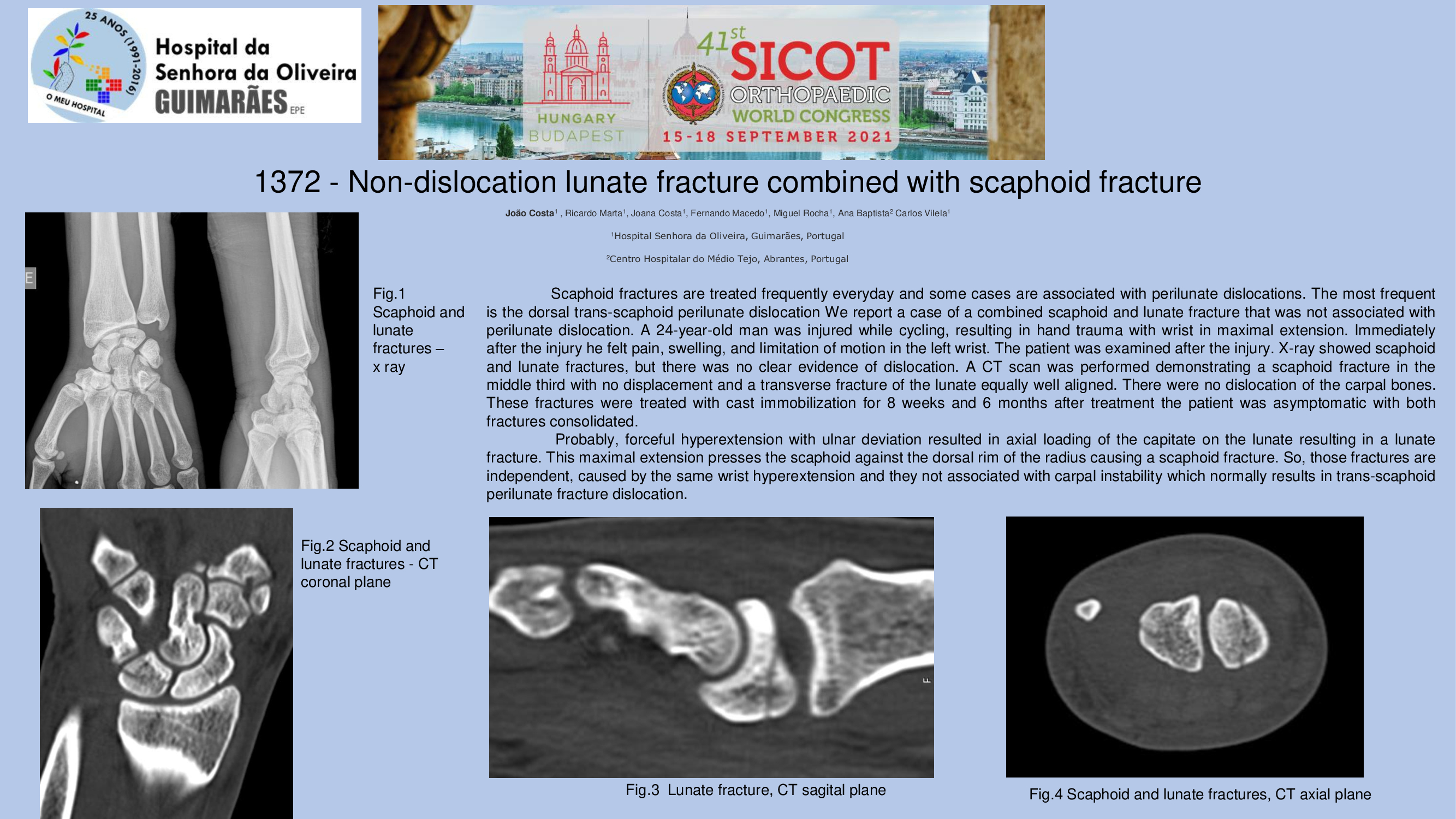 Scaphoid fractures are treated frequently in everyday and some cases are associated with perilunate dislocations. The most frequent is the dorsal trans-scaphoid perilunate dislocation We report a case of a combined scaphoid and lunate fracture that was not associated with perilunate dislocation. A 24-year-old man was injured while cycling, resulting in hand trauma with wrist in maximal extension. Immediately after the injury he felt pain, swelling, and limitation of motion in the left wrist. The patient was examined after the injury. X-ray showed scaphoid and lunate fractures, but there was no clear evidence of dislocation. A CT scan was performed demonstrating a scaphoid fracture in the middle third with no displacement and a transverse fracture of the lunate equally well aligned. There were no dislocation of the carpal bones. These fractures were treated with cast immobilization for 8 weeks and 6 months after treatment the patient was asymptomatic with both fractures consolidated. Probably, forceful hyperextension with ulnar deviation resulted in axial loading of the capitate on the lunate resulting in a lunate fracture. This maximal extension presses the scaphoid against the dorsal rim of the radius causing a scaphoid fracture. So, those fractures are independent, caused by the same wrist hyperextension and they not associated with carpal instability which normally results in trans-scaphoid perilunate fracture dislocation.