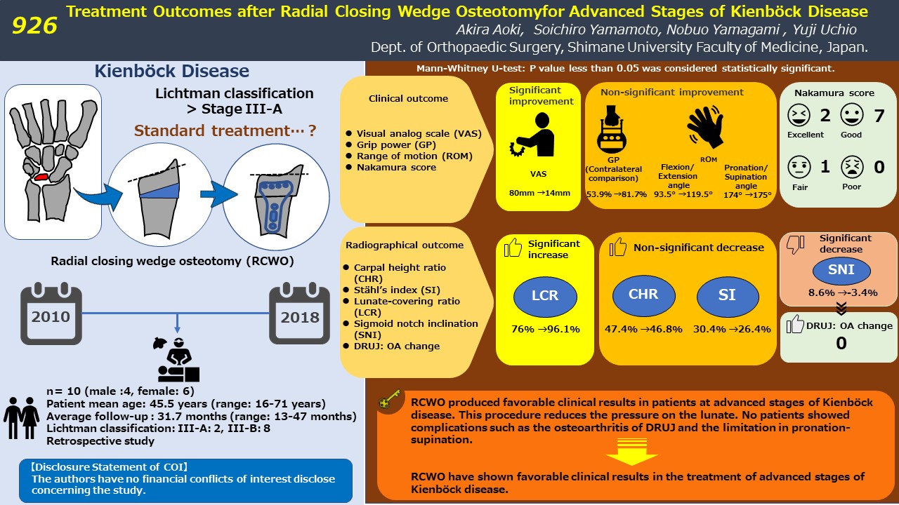 Introduction: We retrospectively evaluated the clinical and radiological outcomes of radial closing wedge osteotomy (RCWO) for the advanced stages of Kienböck disease.