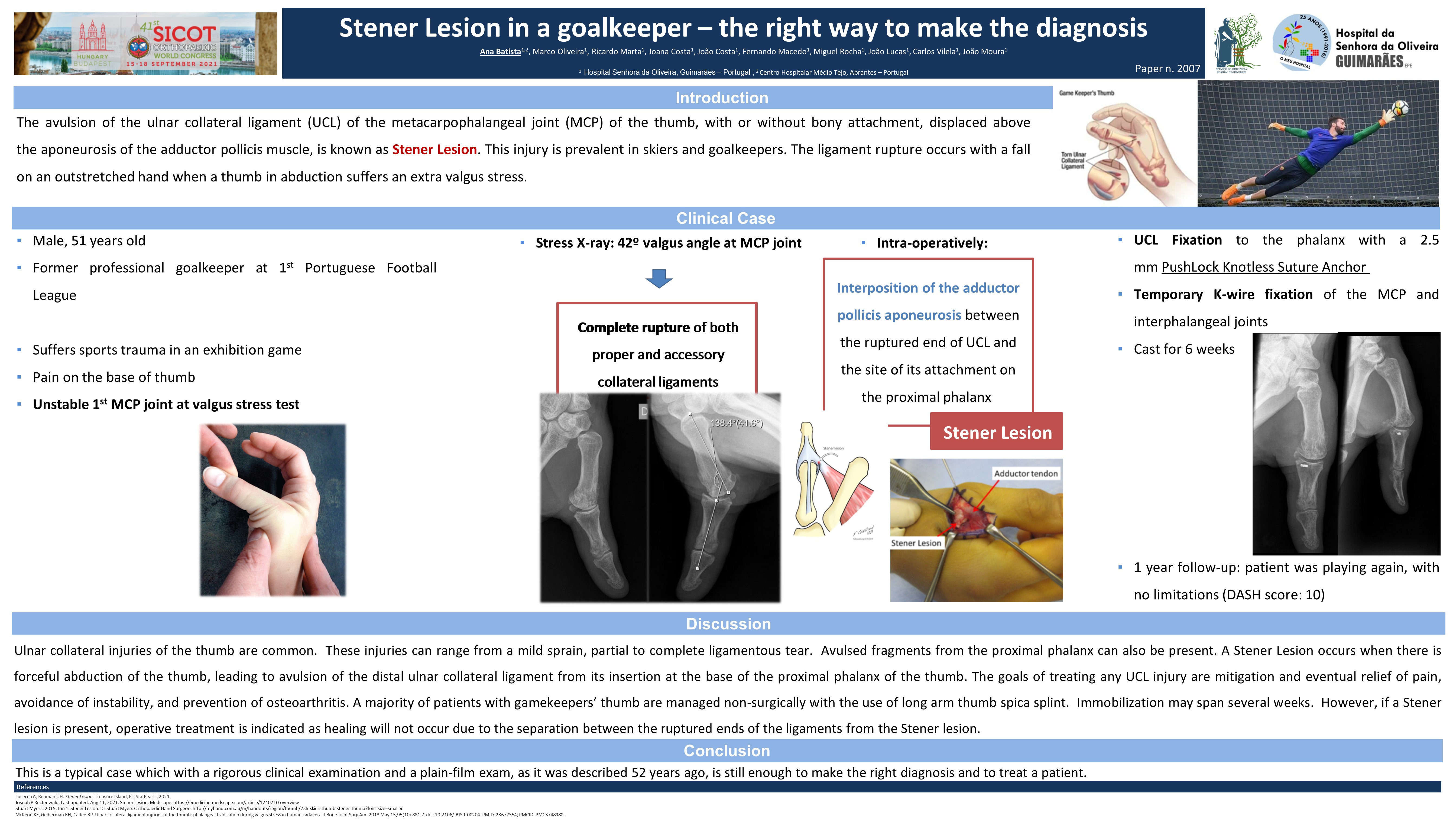 The avulsion of the ulnar collateral ligament (UCL) of the metacarpophalangeal joint (MCP) of the thumb, with or without bony attachment, displaced above the aponeurosis of the adductor pollicis muscle, is known as Stener Lesion. This injury is prevalent in skiers and goalkeepers. The ligament rupture occurs with a fall on an outstretched hand when a thumb in abduction suffers an extra valgus stress. Clinical case of a former goalkeeper in professional and national teams, documented with images of the clinical examination, valgus stress x-rays, 1 year follow-up. Male, 51 years-old, came to emergency department referring pain at the base of the thumb, after a sports trauma in an exhibition game. On clinical examination, the MCP joint proved to be unstable upon abduction. Stress x-rays: 42º valgus angle at MCP which correlates with complete rupture of both proper and accessory collateral ligaments. Intra-operatively: interposition of the adductor pollicis aponeurosis between the ruptured end of UCL and the site of its attachment on the proximal phalanx - Stener Lesion. UCL was then fixed to the phalanx with a 2.5 mm PushLock Knotless Suture Anchor and it was performed a temporary K-wire arthrodesis of the MCP and interphalangeal joints. Cast for 6 weeks. After one-year follow-up the patient is playing again, with no limitations (DASH score: 10). This is a typical case which with a rigorous clinical examination and a plain-film exam, as it was described 52 years ago, is still enough to make the right diagnosis and to treat a patient.