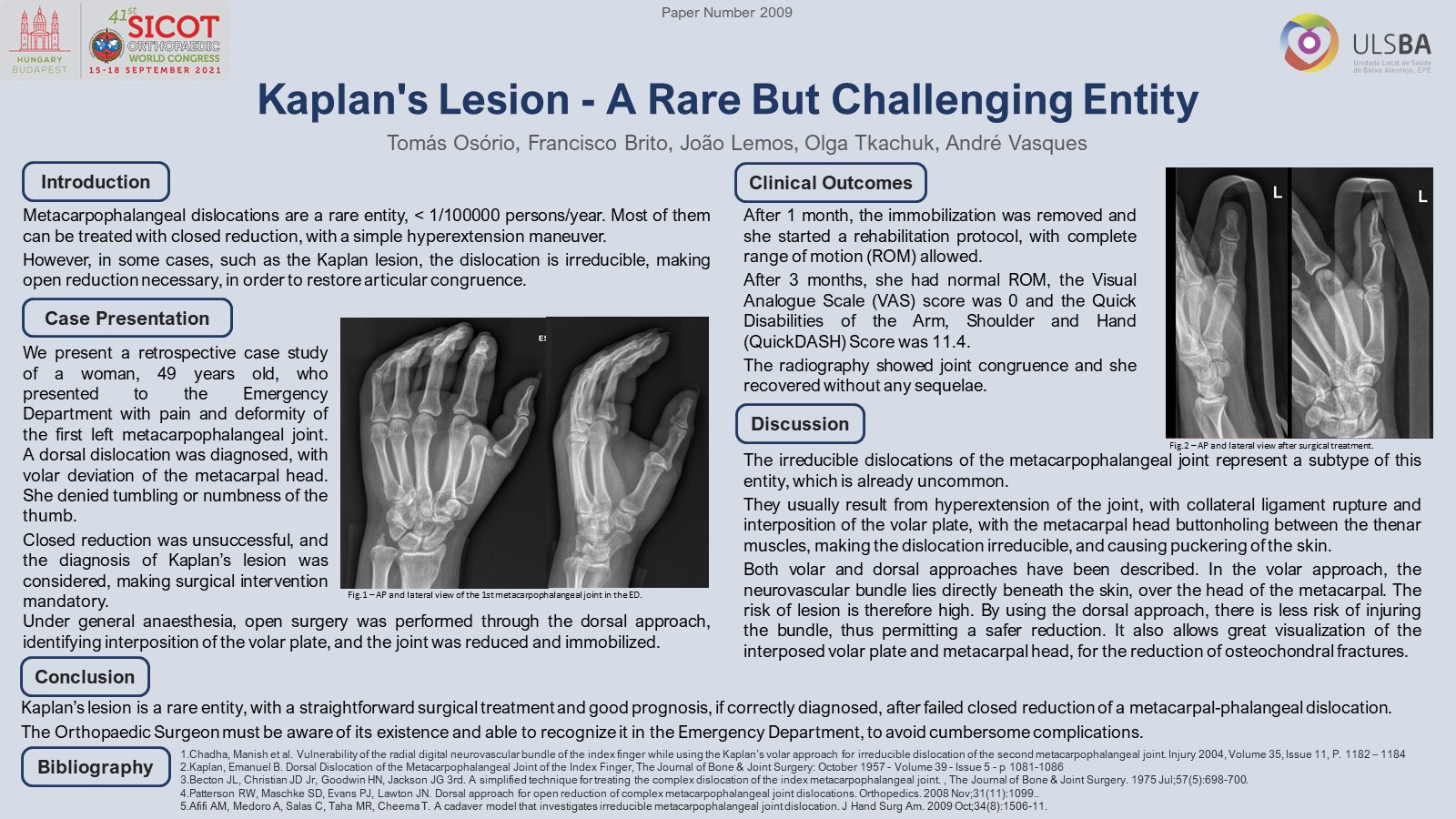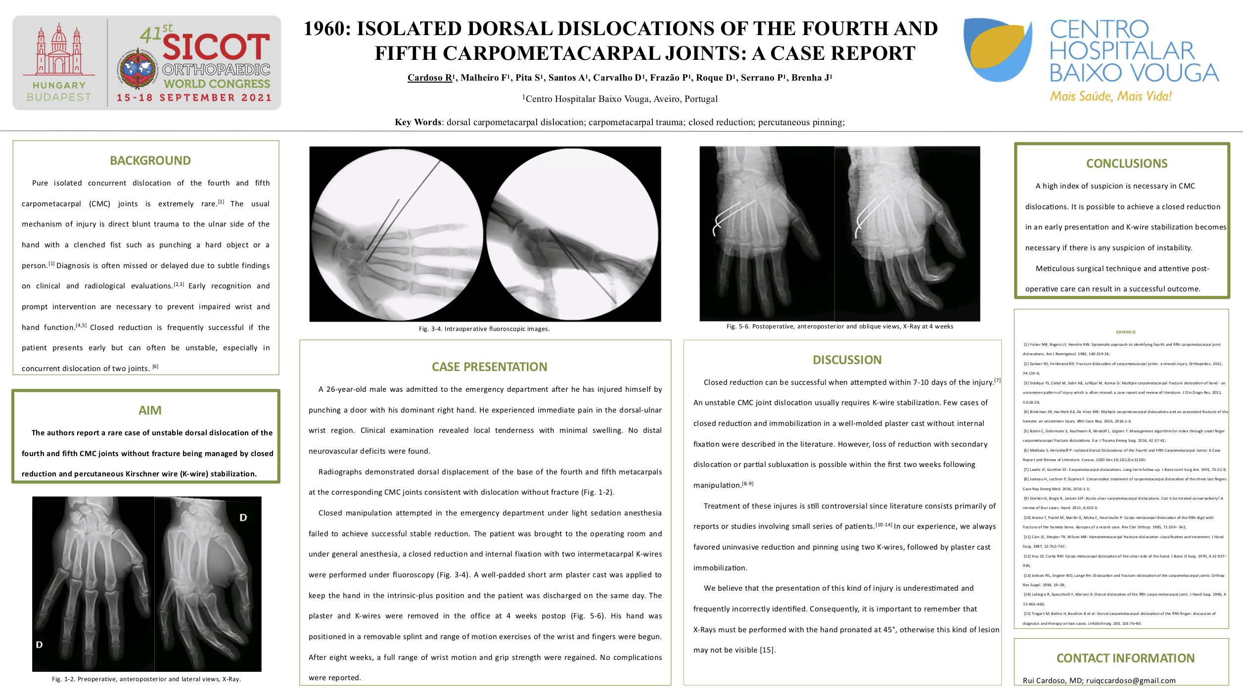 Clinical Outcomes: Acute compartment pressure release was immediately obtained. The patient initiated antibiotherapy, cryotherapy and limb elevation. The fasciotomies were closed at 2 weeks, K-wires removal at 4 weeks. The patient wore a sling immobilization for six weeks. After the follow-up clinic the patient has initiated a rehabilitation program. In forth month of follow up, the patient had pain (VAS 2) and limitation of 15º flexion the affected CMC joints. After 18 months of follow up the patient has no significant pain and has full range of motion.