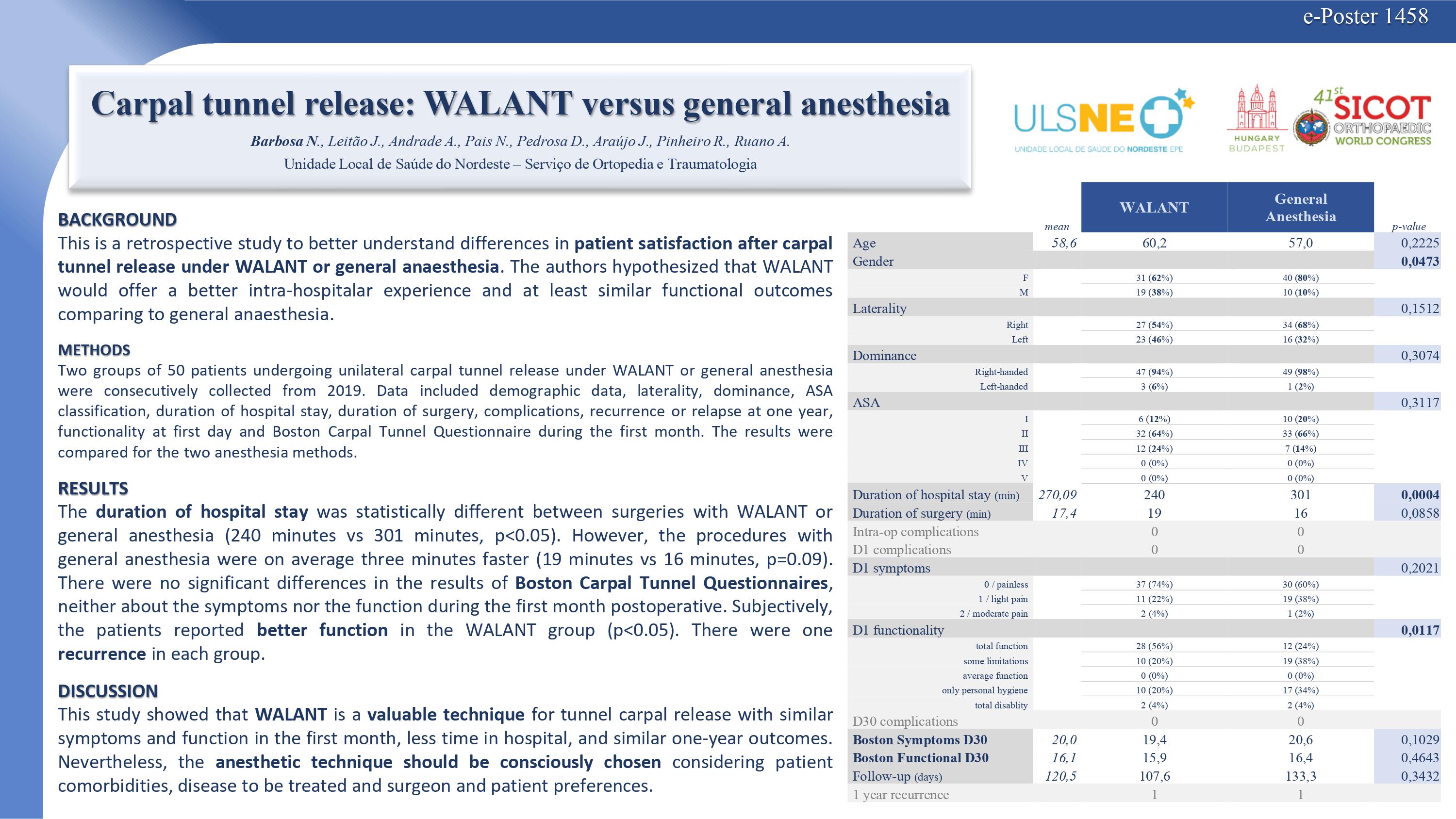 This is a retrospective study to better understand differences in patient satisfaction after carpal tunnel release under WALANT or general anaesthesia. The authors hypothesized that WALANT would offer a better intra-hospitalar experience and at least similar functional outcomes comparing to general anaesthesia.
