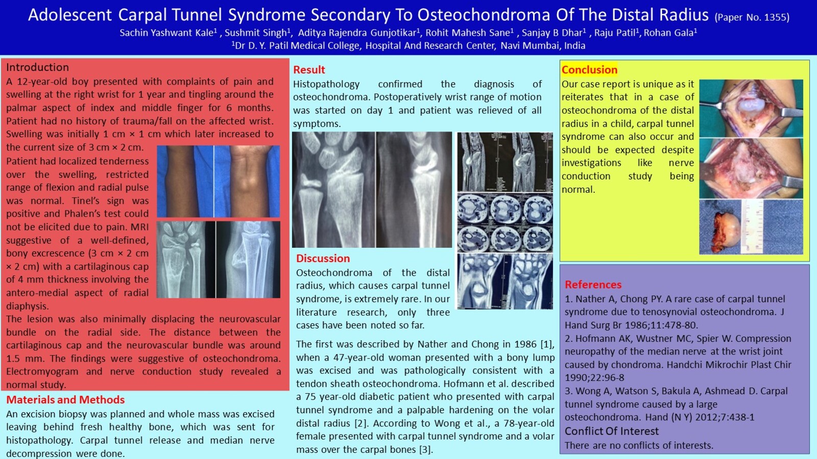 Our case report is unique in it’s own way as it reminds us that when presented with a case of osteochondroma of the distal radius in children, carpal tunnel syndrome can also occur.