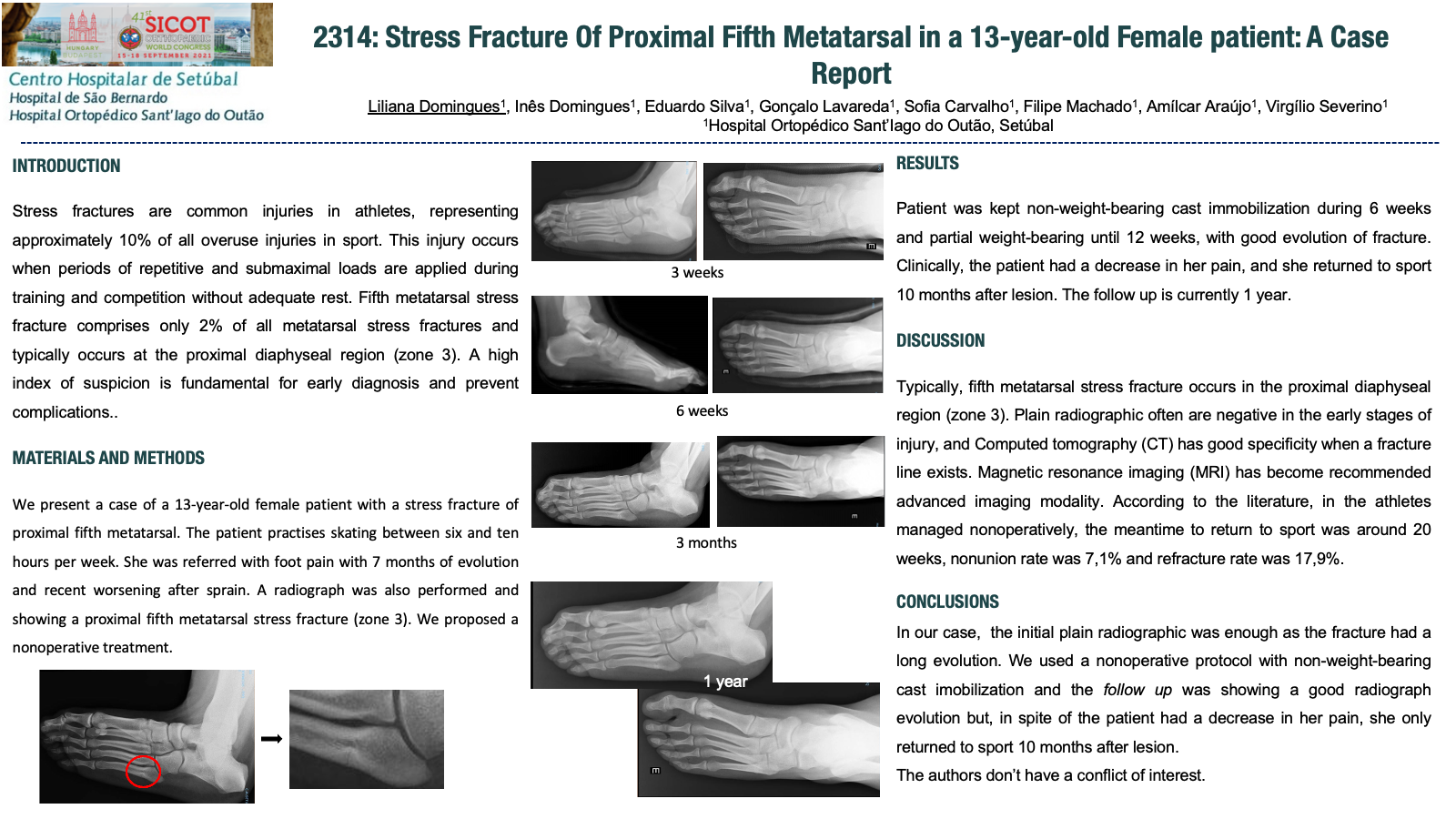 Stress fractures are common injuries in athletes, representing 10% of all overuse injuries in sport. This injury occurs when periods of repetitive and submaximal loads are applied without adequate rest. Fifth metatarsal stress fracture comprises only 2% of all metatarsal stress fractures and typically occurs at the proximal diaphyseal region (zone 3). A high index of suspicion is fundamental for early diagnosis and prevent complications. We present a case of a 13-year-old female patient with a stress fracture of proximal fifth metatarsal. The patient practises skating between six and ten hours per week. She was referred with foot pain with 7 months and recent worsening after sprain. A radiograph was showing a proximal fifth metatarsal stress fracture (zone 3). We proposed a nonoperative treatment with non-weight-bearing cast immobilization during 6 weeks and partial weight-bearing until 12 weeks. The patient had a decrease in her pain, and she returned to sport 10 months after lesion. Discussion: Typically, fifth metatarsal stress fracture occurs in zone 3. Plain radiographic often are negative in the early stages of injury, and CT has good specificity when a fracture line exists. MRI has become recommended advanced imaging modality. According to the literature, in the athletes managed nonoperatively, the meantime to return to sport was around 20 weeks, nonunion rate was 7,1% and refracture rate was 17,9%. In our case, we used a nonoperative protocol and the follow up was showing a good radiograph evolution buT she only returned to sport 10 months after lesion.