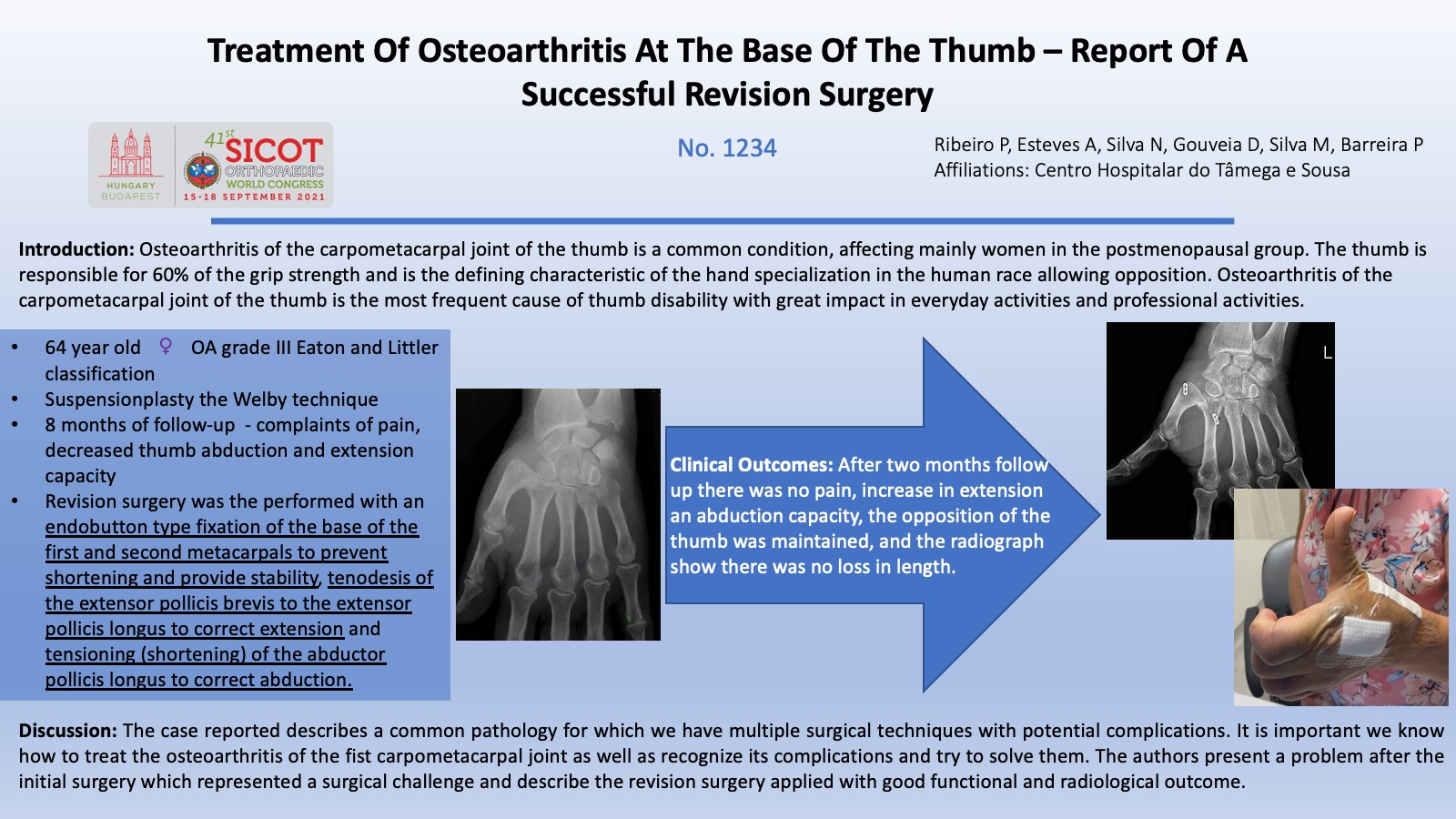 The authors report a case of a 64 year old woman that presented to the hospital with base thumb deformity, pain and loss of grip strength. The radiograph revealed osteoarthritis of the carpometacarpal joint of the thumb (grade III in the Eaton and Littler classification). She was treated with a resection arthroplasty of the trapezium with suspensionplasty using the Welby technique. At 8 months of follow-up the patient remain with complaints of pain, decreased thumb abduction and extension capacity. Revision surgery was the performed with an endobutton type fixation of the base of the first and second metacarpals to prevent shortening and provide stability, tenodesis of the extensor pollicis brevis to the extensor pollicis longus to correct extension and tensioning (shortening) of the abductor pollicis longus to correct abduction.