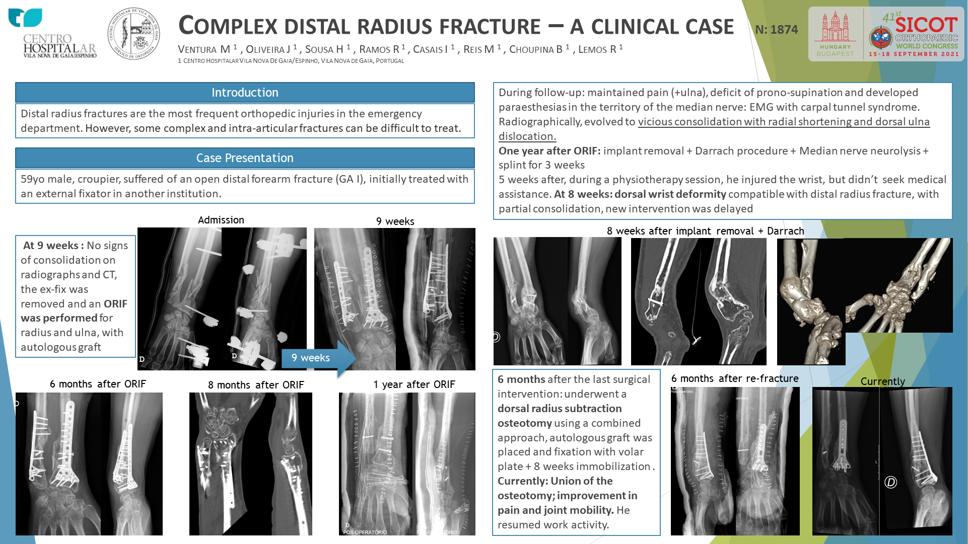 Distal radius fractures are the most frequent orthopedic injuries in the emergency department. We present a case of an open distal forearm fracture (GA I), complicated by delay consolidation and vicious consolidation. External fixation was first performed. At 9 weeks, still without signs of consolidation on radiographs and CT, the ex-fix was removed and an ORIF was performed for radius and ulna, with autologous graft placement. Immobilization with splint was kept for 6 weeks, after which started rehabilitation. During follow-up, he maintained pain, mainly on the ulna, deficit of prono-supination and developed paraesthesias in the territory of the median nerve being diagnosed with carpal tunnel syndrome. Radiographically, fractures evolved to vicious consolidation with radial shortening and dorsal ulna dislocation. One year after ORIF, he underwent removal of the material, Darrach procedure and neurolysis of the median nerve. He was immobilized with a splint for 3 weeks, after which he resumed rehabilitation. 5 weeks after, during a physiotherapy session, he injured the wrist, but didn’t seek medical assistance. At 8 weeks, he presented dorsal wrist deformity compatible with distal radius fracture, with radiographic signs of partial consolidation, so a new intervention was delayed. 6 months after the last surgical intervention, he underwent a dorsal radius subtraction osteotomy using a combined approach, autologous graft was placed and fixation with volar plate. He was immobilized with plaster cast for 8 weeks. Currently the osteotomy is consolidated and after functional rehabilitation, there is an improvement in pain and joint mobility. He resumed work activity.