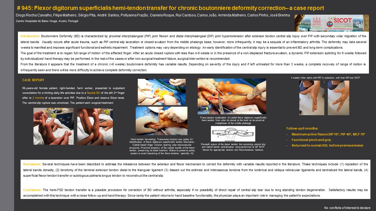 Introduction: The Boutonniere Deformity (BD) is a complex finger deformity that results from extensor tendon central slip injury over PIP with secondary volar migration of the lateral bands. Usually occurs after acute trauma or as a sequela of an inflammatory arthritis. It may take several weeks to manifest and imposes significant functional hand impairment. The goal of treatment is to correct deformity and regain full range of motion of the affected finger. Several techniques have been described with variable reported results. Depending on severity of the injury and if left untreated for more than 3 weeks, a complete recovery of range of motion is infrequently seen and there will be more difficulty to achieve complete deformity correction.