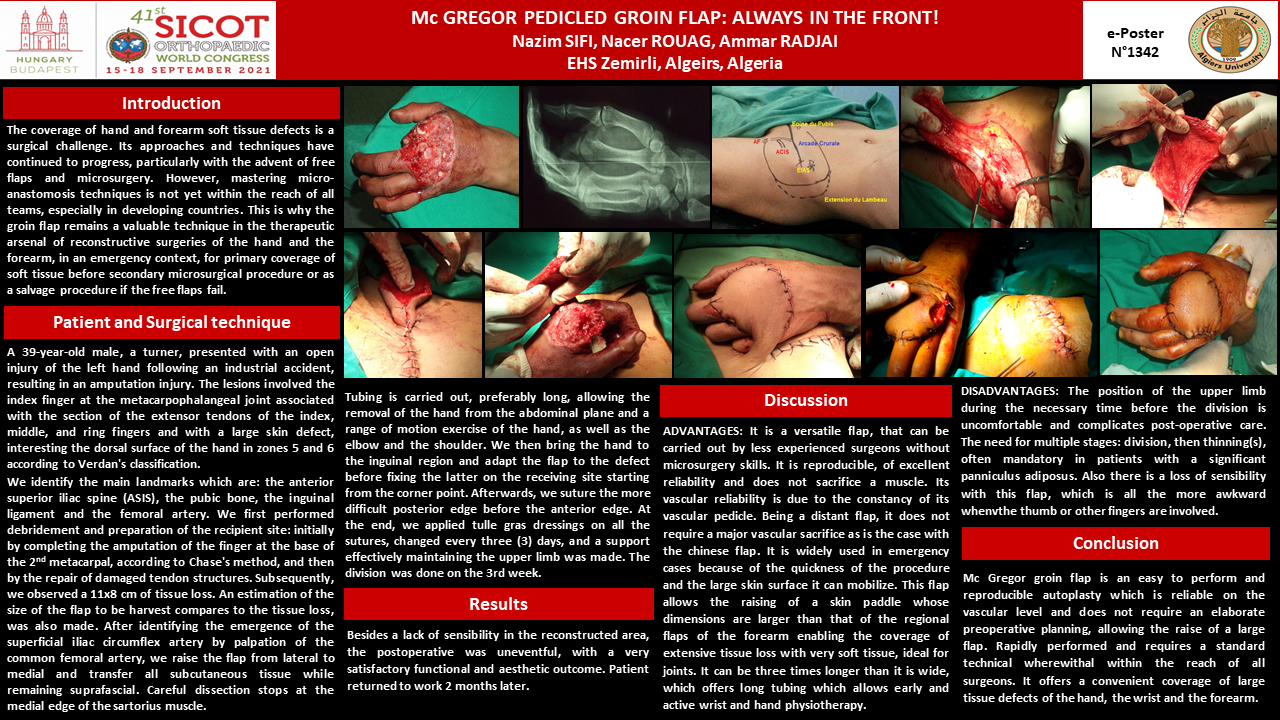 McGregor flap is an axial pattern flap, also known as a pedicled groin flap. It is a highly reliable flap for large tissue defect of the hand (dorsal or palmar surfaces), the wrist or the forearm, up to the elbow. Based on its own arteriovenous pedicle (the superficial iliac circumflex artery), with a constant vascular system, it can be easily transferred with acceptable aesthetic changes. Therefore, McGregor flap remains a flap of choice in the therapeutic arsenal of emergency hand surgery. We present the case of a patient presenting an amputation injury following an industrial accident, the lesions involve the index finger at the metacarpophalangeal joint associated with the section of the extensor tendons of the index, middle, and ring fingers and large cutaneous defect, affecting the dorsal surface of the hand in zones 5 and 6 of Verdan. Through this study, we try to present the anatomical basis as well as the different operating steps with their technical requirements allowing the safe and easy performance of this flap. McGregor flap offers a larger coverage surface than the regional forearm flaps. Being a distant flap, it does not require a major vascular sacrifice as is the case with the radial ‘chinese’ flap. With a very low likelihood of retraction, it can indifferently cover dorsal or palmar defects. It can be three times longer than it is wide, which can offer a long pedicle and subsequently enables early and active rehabilitation of the wrist and the hand.