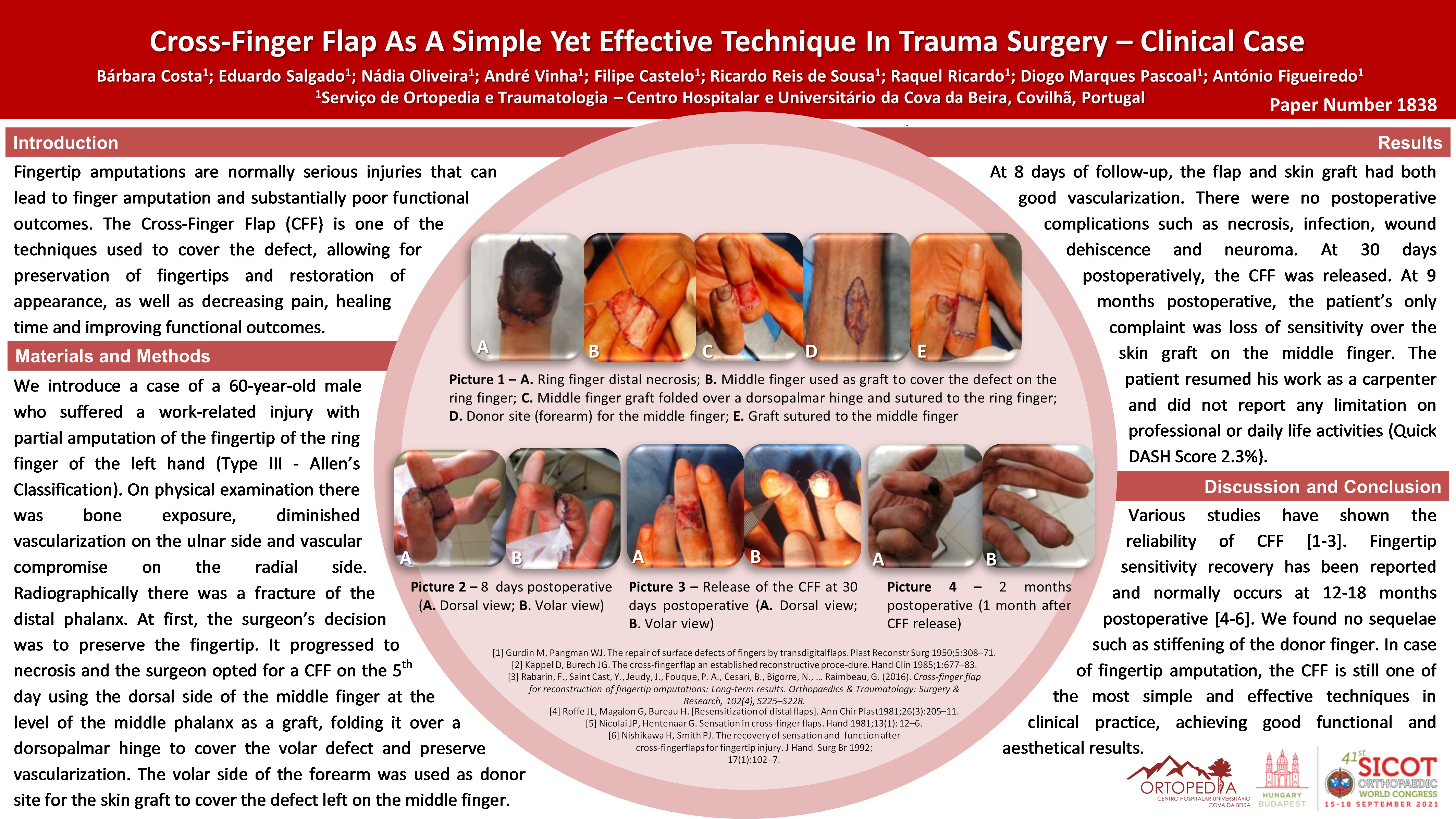 Introduction: Fingertip amputations normally have poor functional outcomes. Cross-Finger Flap (CFF) is one of the techniques used to cover defects, allowing for finger preservation and improvement of pain, healing time and functional outcomes. Methods: A sixty-year-old male suffered a work-related injury with partial amputation of fingertip on the ring finger (Type III - Allen’s Classification). On physical examination there was bone exposure, diminished vascularization on the ulnar side and vascular compromise on the radial side. The fingertip was preserved but as it progressed to necrosis, on the fifth day after admission, a CFF was made using the dorsal side of the middle finger as a graft, folding it over a dorsopalmar hinge to cover the volar defect and preserve vascularization. The volar side of the forearm was used as a skin graft to cover the defect left on the donor finger. Results: At eight days postoperatively, the flap and skin graft had both good vascularization. The CFF was released after four weeks and at nine months postoperatively, the patient’s only complaint was the loss of sensitivity over the skin graft on the middle finger. The patient resumed work as a carpenter and did not report any limitation on professional or daily life activities (Quick DASH Score 2.3%). There were no complications reported such as necrosis, infection, wound dehiscence or neuroma. Discussion: In cases of fingertip amputation, the CFF still is one of the most simple and effective techniques in clinical practice, achieving good functional and aesthetical results.
