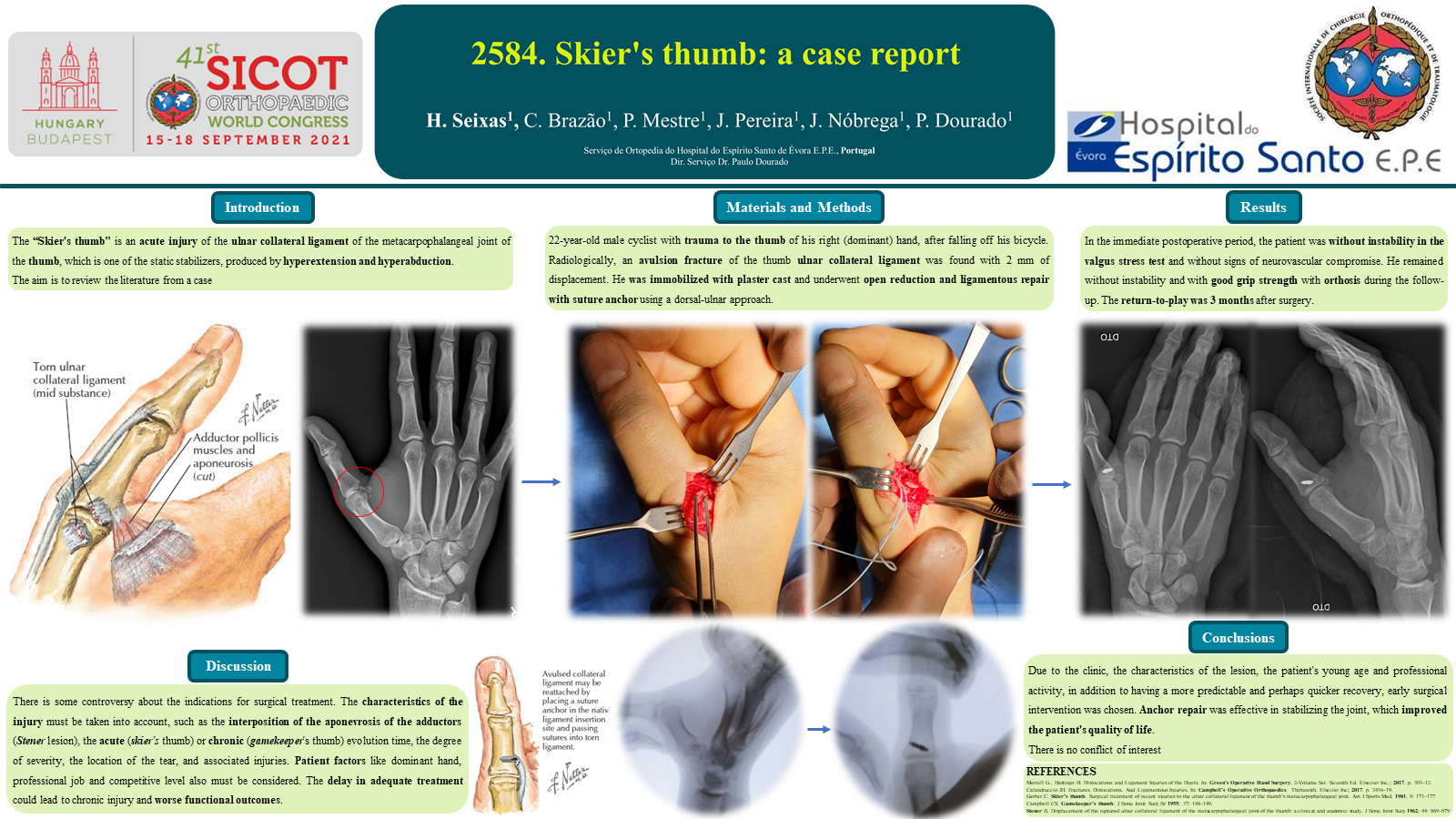 The "skier's thumb" is an acute injury of the ulnar collateral ligament of the metacarpophalangeal joint of the thumb, which is one of the static stabilizers, produced by hyperextension and hyperabduction. The aim is to review the literature from a case. We presented a 22-year-old male cyclist with trauma to the thumb of his right (dominant) hand, after falling off his bicycle. Radiologically, an avulsion fracture of the thumb ulnar collateral ligament was found with 2 mm of displacement. He was immobilized with plaster cast and underwent open reduction and ligamentous repair with suture anchor using a dorsal-ulnar approach. In the immediate postoperative period, the patient was without instability in the valgus stress test and without signs of neurovascular compromise. He remained without instability and with good grip strength with orthosis during the follow-up. The return-to-play was 3 months after surgery. There is some controversy about the indications for surgical treatment. The characteristics of the injury must be taken into account, such as the interposition of the aponevrosis of the adductors (Stener lesion), the acute ("skier's thumb") or chronic ("gamekeeper's thumb") evolution time, the degree of severity, the location of the tear, and associated injuries. Patient factos like dominant hand, professional job and competitive level also must be considered. The delay in adequate treatment could lead to chronic injury and worse functional outcomes. Anchor repair was effective in stabilizing the joint, which improved the patient's quality of life.