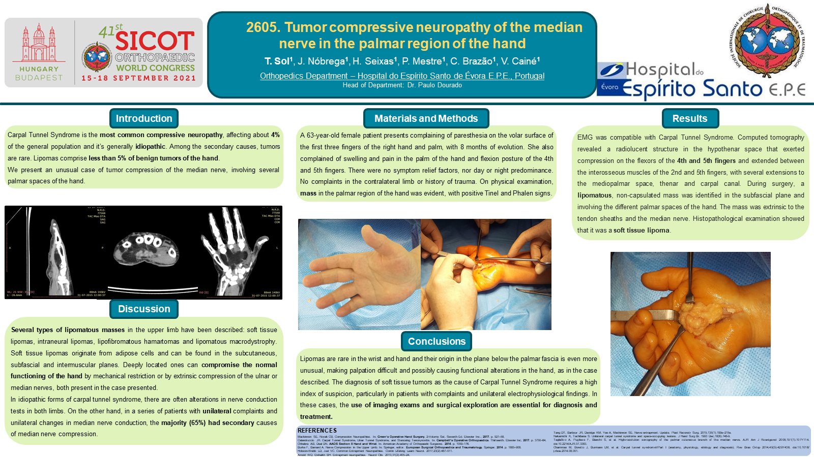 Carpal Tunnel Syndrome is the most common compressive neuropathy, affecting about 4% of the general population, usually idiopathic. Lipomas constitute less than 5% of benign tumors of the hand. 63-year-old female with complaints of paresthesias on the first three fingers of the right hand and palm of the hand since 8 months ago, with edema and pain in the palm of the hand and flexed posture of the 4th and 5th fingers. Positive Tinel and Phalen. Electromyogram was compatible with Carpal Tunnel Syndrome. CT revealed a structure in the hypotenar space that exerted compression of the flexors of the 4th and 5th fingers and extended between the interosseous muscles from the 2nd to the 5th finger. In surgery, a lipomatous mass, was identified in the subfascial plane with involvment of the various palmar spaces of the hand. The mass was extrinsic to the tendon sheaths and the median nerve. Histopathological examination showed a lipoma.