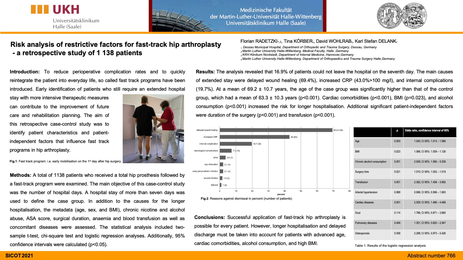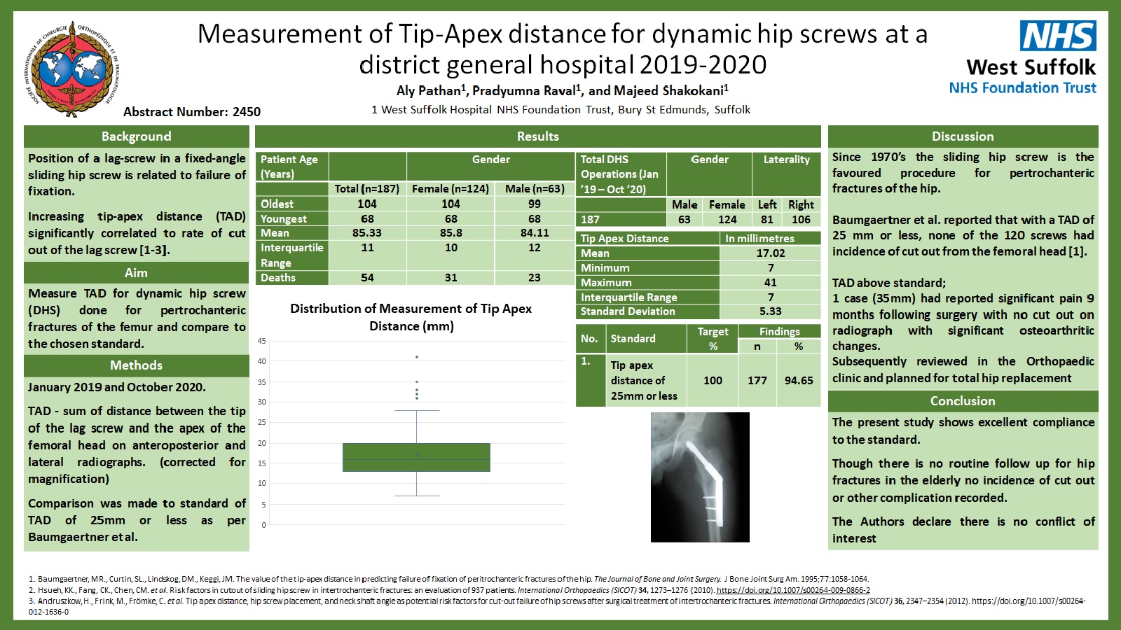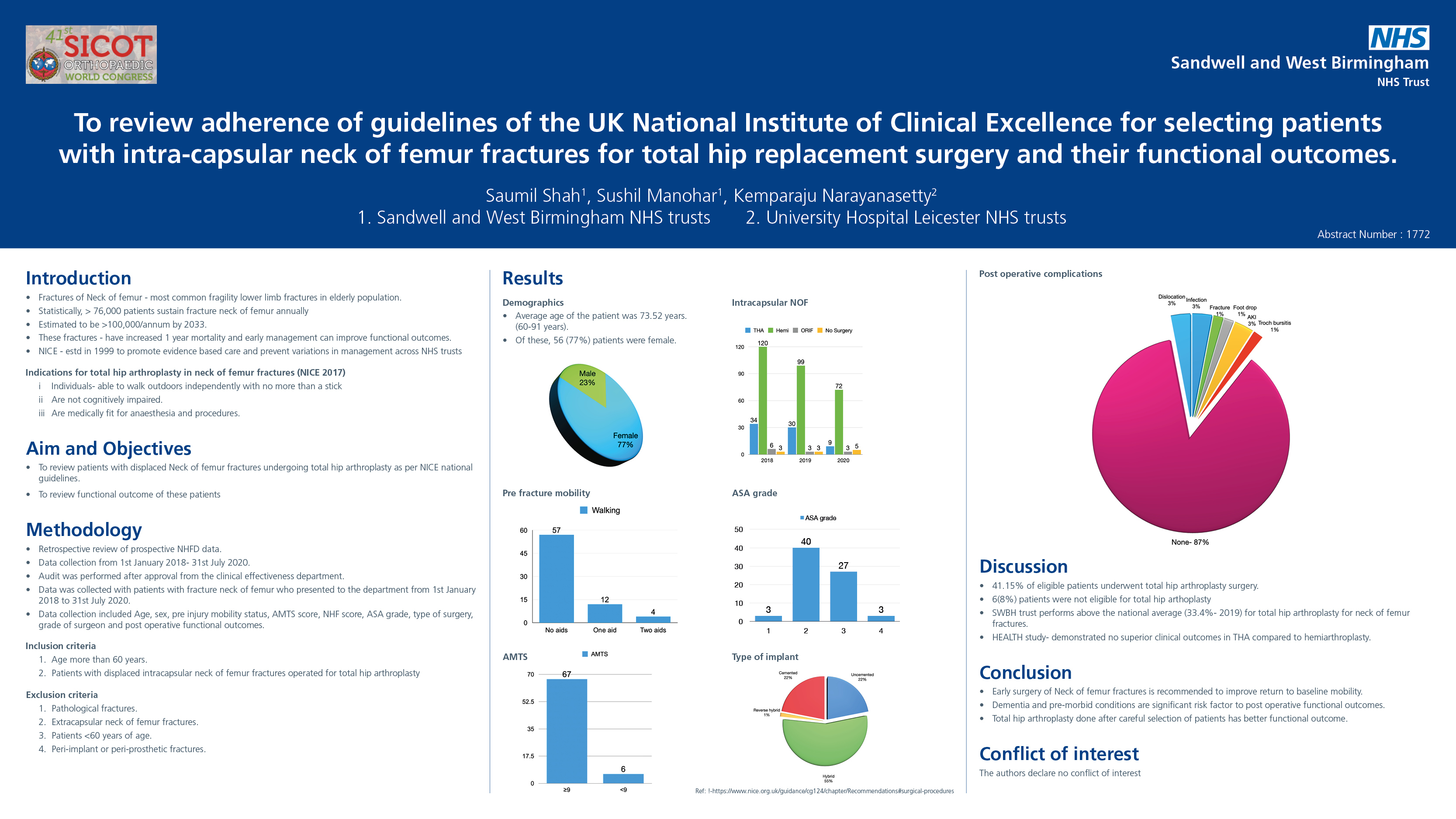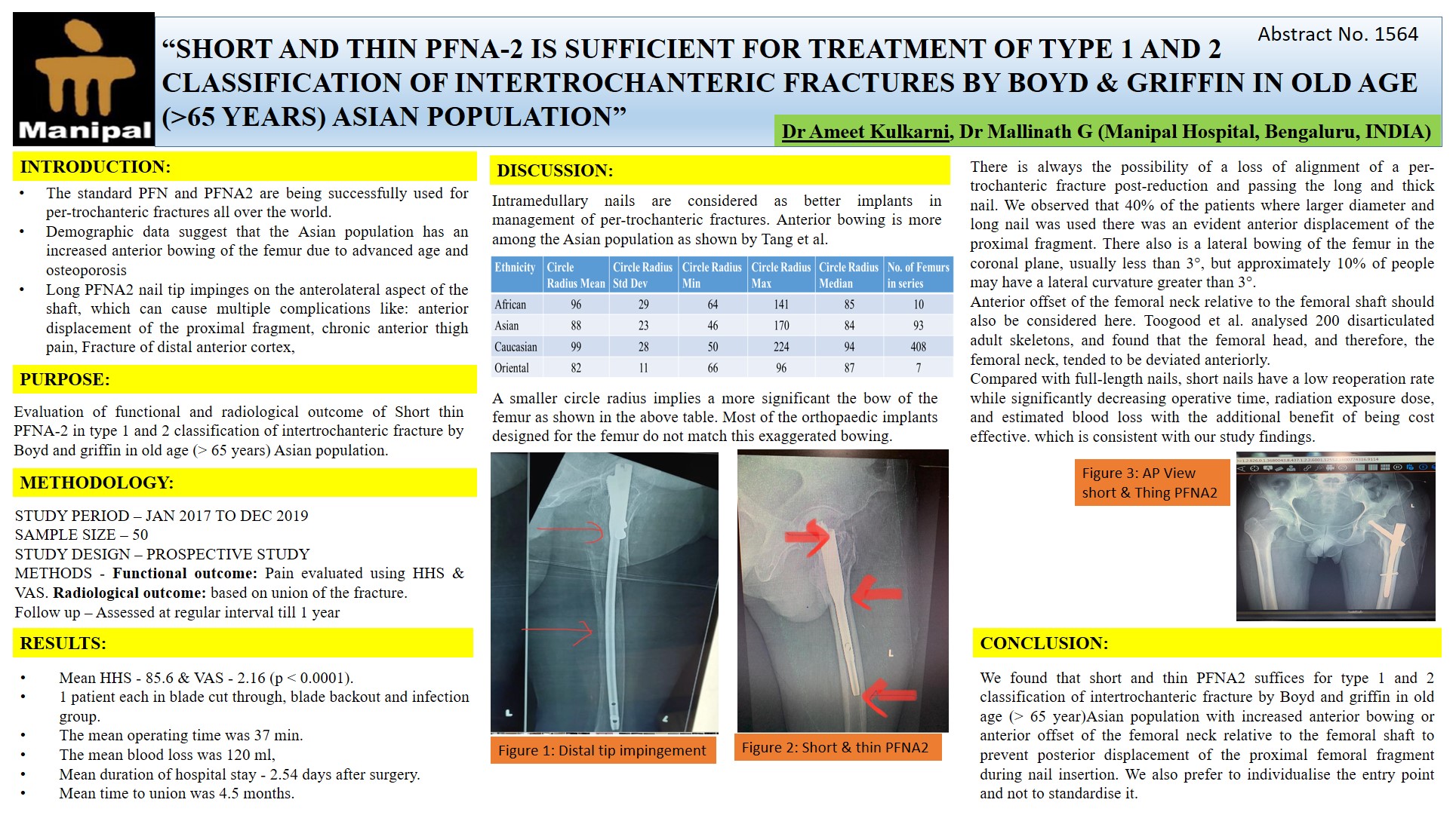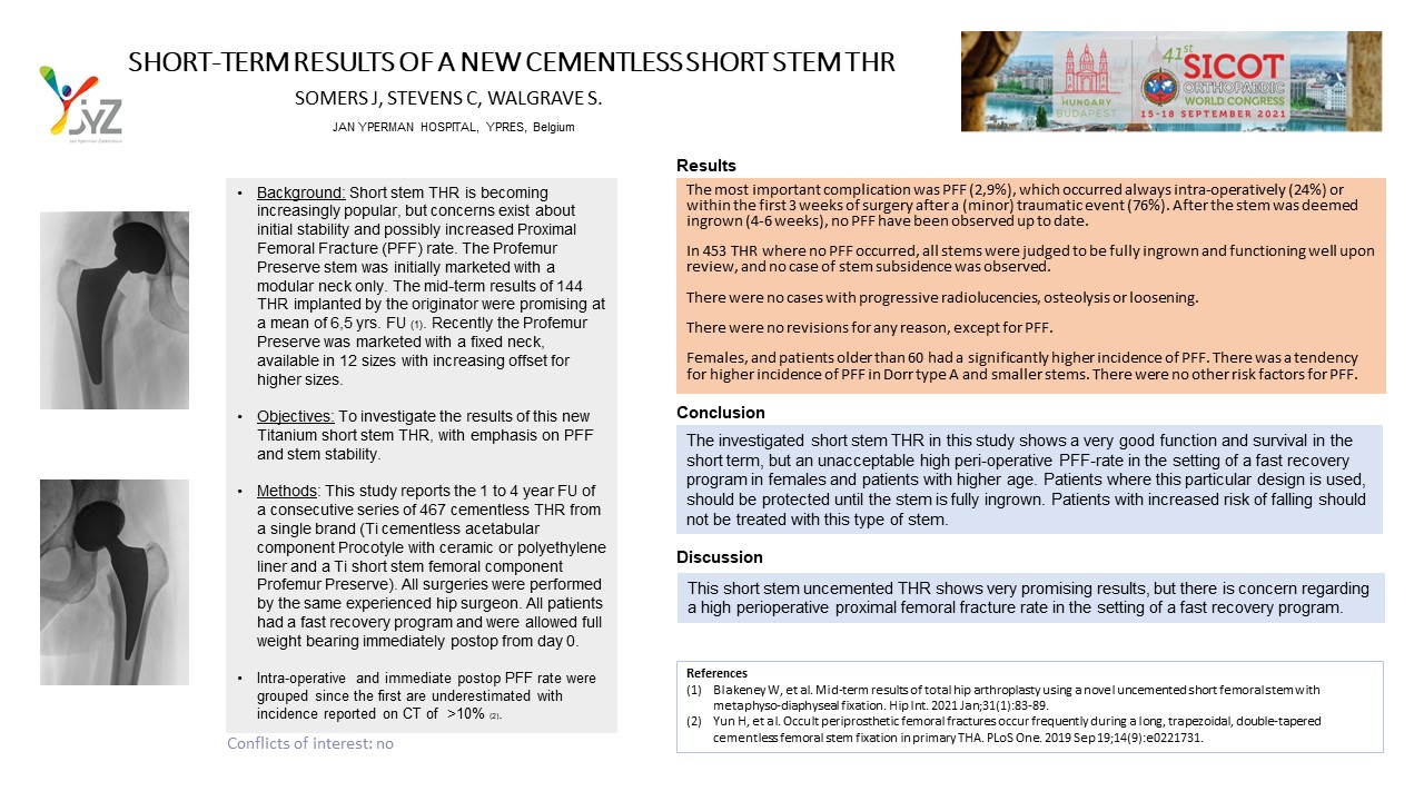 Conclusion: The investigated short stem THR in this study shows a very good function and survival in the short term, but an unacceptably high peri-operative PFF-rate in the setting of a fast recovery programme in females and patients of higher age. Patients where this particular design is used, should be protected untill the stem is fully ingrown.