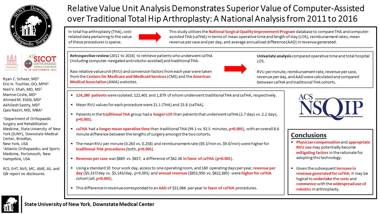 Introduction: Studies into cost-related data pertaining to the value computer-assisted surgery is sparse. Relative value units (RVUs), used by the Centers for Medicaid and Medicare Services (CMS), have been utilized to assess the value of operative time. The purpose of this study was to compare operative and financial differences in traditional and computer-assisted (caTHA) THAs. Methods: The American College of Surgeons National Surgical Quality Improvement Program (ACS NSQIP) database was utilized to identify patients from 2011 to 2016 who underwent caTHA and traditional THA via Current Procedural Terminology codes. Raw RVU values and conversion factors were taken from the CMS and American Medical Association websites. Univariate analysis compared operative time, length of stay, mean RVUs, reimbursement rate, and revenue. Results: 124,280 patients were identified, 122,401 and 1,879 underwent traditional THA and caTHA, respectively. Patients in the THA group had a longer LOS (2.7 vs. 2.2 days, p<0.001). caTHA had longer mean operative time than THA (99.1 vs. 92.5 minutes, p<0.001). The mean RVU per minute (0.26 vs. 0.25) and reimbursement rate ($9.27/min vs. $9.0/min) were higher for THA (both, p<0.001). Revenue per case ($889.53 vs. $857.17) and per day ($5,337.19/day vs. $5,143.03/day) were all significantly higher for caTHA than THA procedures (both, p<0.001). Conclusion: This study found that patients who underwent THA had shorter operative times but lengthier LOS than caTHA patients. Traditional THA procedures had higher reimbursement rates but generated lower revenue per case and per day than caTHA, an average difference in revenue of $31,065.60 per year.