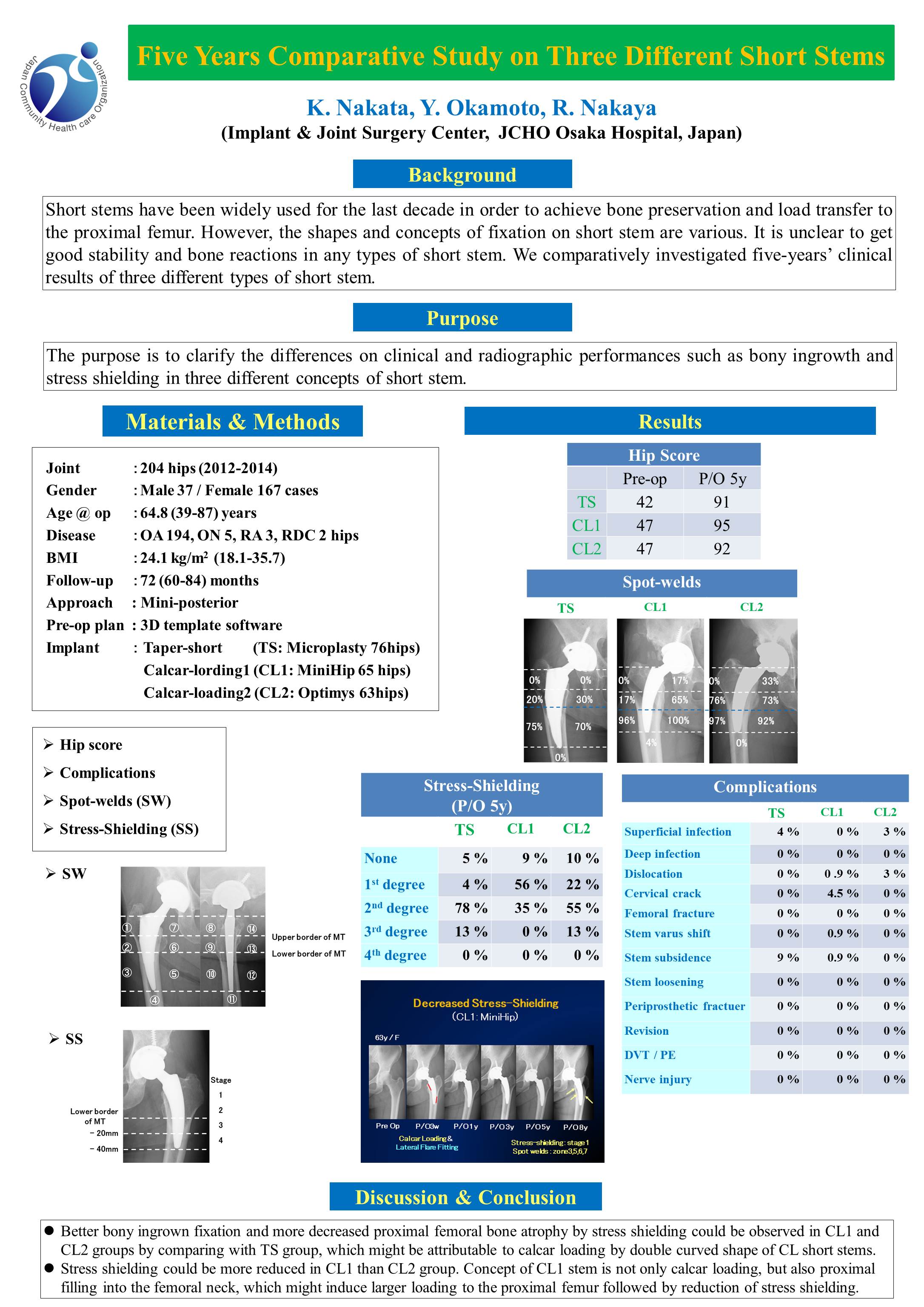 Two hundred four patients who were underwent THA by three different types of short stem were enrolled between 2012 and 2014. There were 167 females and 37 males. The average age at operation was 65 years old. The average follow-up term was 72 months (60-84 months). Ninety-six percent was osteoarthritis of the hip. Patients were classified into three groups (Tapered short (TS): 76 hips, Calcar-loading short (CL1): 65 hips, CL2: 63 hips) by the type of stem concept. Clinical hip score and radiographic stem stability and bone reactions around the stem such as spot welds and stress shielding to the proximal femur were estimated.