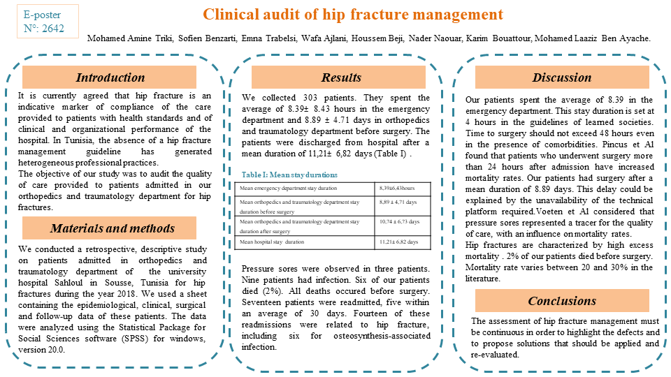 The objective of our study was to audit the quality of care provided to patients admitted in our orthopedics and traumatology department for hip fractures.