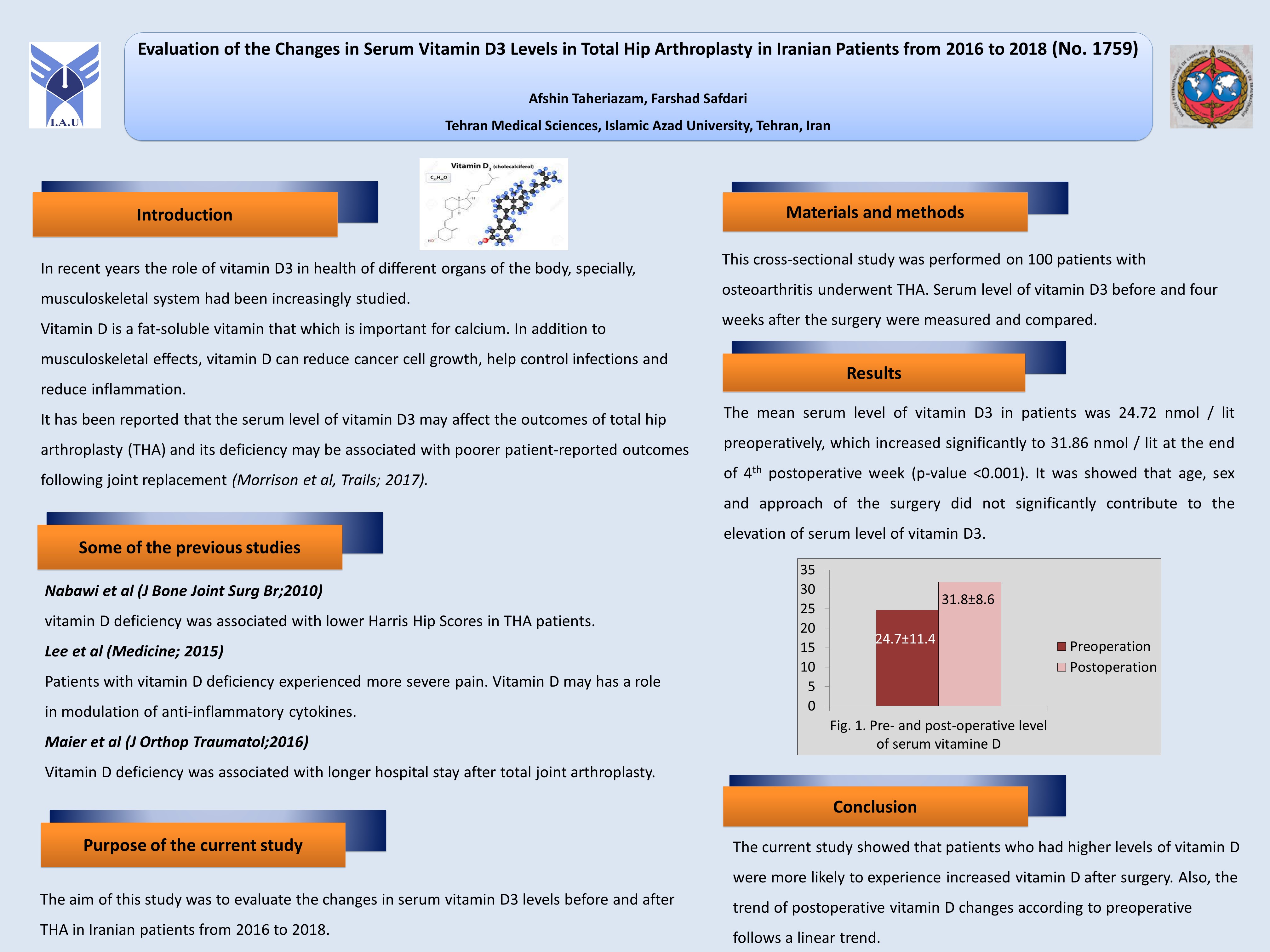 Introduction: In recent years the role of vitamin D3 in health of different organs of the body, specially, musculoskeletal system had been increasingly studied. It has been reported that the serum level of vitamin D3 may affect the outcomes of total hip arthroplasty (THA). The aim of this study was to evaluation of the changes in serum vitamin D3 levels before and after THA in Iranian patients from 2016 to 2018. Methods: This cross-sectional study was performed on 100 patients with osteoarthritis underwent THA. Serum level of vitamin D3 before and four weeks after the surgery were measured and compared. Results: The mean serum level of vitamin D3 in patients was 24.72 nmol / lit preoperatively, which increased significantly to 31.86 nmol / lit at the end of 4th postoperative week (p-value <0.001). It was showed that age, sex and approach of the surgery did not significantly contribute to the elevation of serum level of vitamin D3. Conclusions: The current study showed that patients who had higher levels of vitamin D were more likely to experience increased vitamin D after surgery. Also, the trend of postoperative vitamin D changes according to preoperative follows a linear trend.
