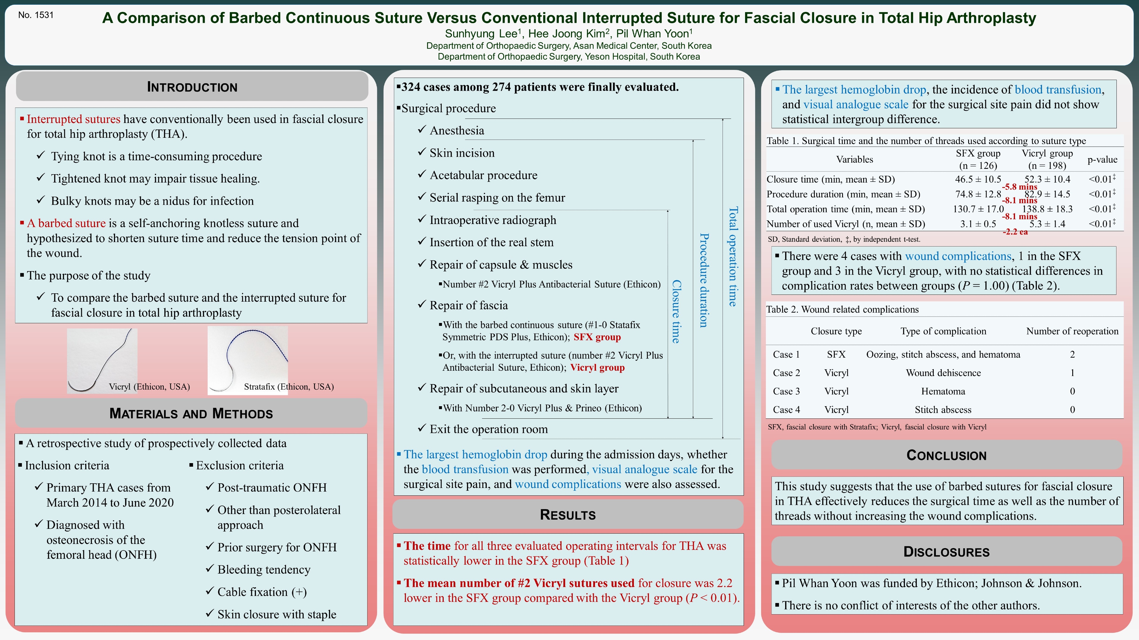 Introduction: A barbed suture is a self-anchoring knotless suture hypothesized to shorten suture time and reduce the tension point of the wound. We compare the barbed suture and the interrupted suture for fascial closure in total hip arthroplasty. Methods: A retrospective study for patients who underwent total hip arthroplasty by a single surgeon from March 2014 to June 2020 was performed. We evaluated 324 cases among 274 patients consisting of 188 males and 86 females. The following data were collected from the medical record: patient demographics, time for wound closure, the number of threads used, hemoglobin level, visual analogue scale for surgical site pain, and wound complications. Variables were analyzed for association with closure time using multiple regression analyses between the group with the barbed suture(the SFX group) and with the interrupted suture(the Vicryl group). Results: Mean closure time was 5.8 minutes lower in the SFX group versus the Vicryl group(P < 0.01). The mean number of #2 Vicryl sutures used for closure was 2.2 lower in the SFX group versus the Vicryl group(P < 0.01). There were no statistical intergroup differences in the mean largest hemoglobin drop, the incidence of transfusion, and surgical site pain. There were 4 cases with wound complications: 1 in the SFX group and 3 in the Vicryl group, which showed no statistical difference(P = 1.00). Conclusions: The use of barbed sutures for fascial closure in THA effectively reduces the surgical time as well as the number of threads without increasing the wound complications.