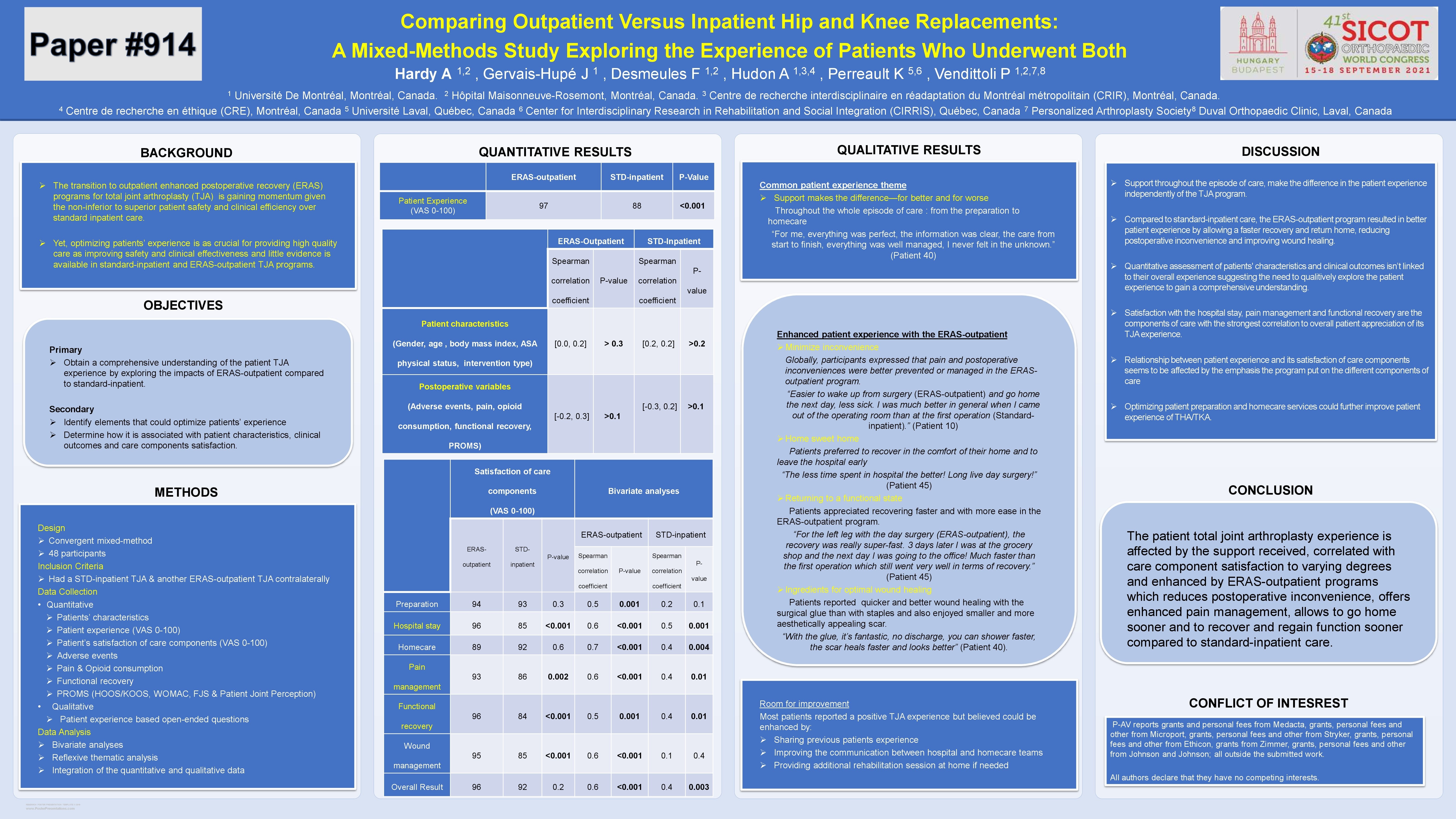 BACKGROUND: The transition to outpatient enhanced postoperative recovery (ERAS) programs for total hip and knee arthroplasty (THA/TKA) is gaining momentum given the non-inferior to superior patient safety and clinical efficiency over standard inpatient care. However, evidence is lacking regarding the third pillar of quality of care: patient experience. This study aim was to obtain a comprehensive understanding of the patient experience by exploring the impacts of ERAS-outpatient compared to standard-inpatient. METHODS: A mixed-methods explanatory study was conducted on 48 patients who experienced both protocols contralaterally. Bivariate analyses were conducted between patient experience score and preoperative, postoperative and care components satisfaction. A reflexive thematic analysis was performed from survey data collection. RESULTS: Spearman correlations coefficient ranged from +/-[.002-.285] for preoperative and postoperative variables to +[.486-.661] for satisfaction of care components. The qualitative analysis identified one common theme across all phases of care: support makes the difference—for better and for worse. Four themes expressed patients enhanced experience with the ERAS-outpatient protocol: minimize inconvenience, home sweet home, returning to a functional state, ingredients for optimal wound healing. Patients suggested that better preoperative education and coherence of care between the medical and home care teams could further optimize their experience. CONCLUSION: Patient experience is fairly to moderately related to their satisfaction with components of THA/TKA care. It can be enhanced by implementing an ERAS-outpatient program that provides support throughout the care episode, minimizes postoperative discomfort, allows a quick return home and functional recovery, and uses wound management modalities that lead to better healing.