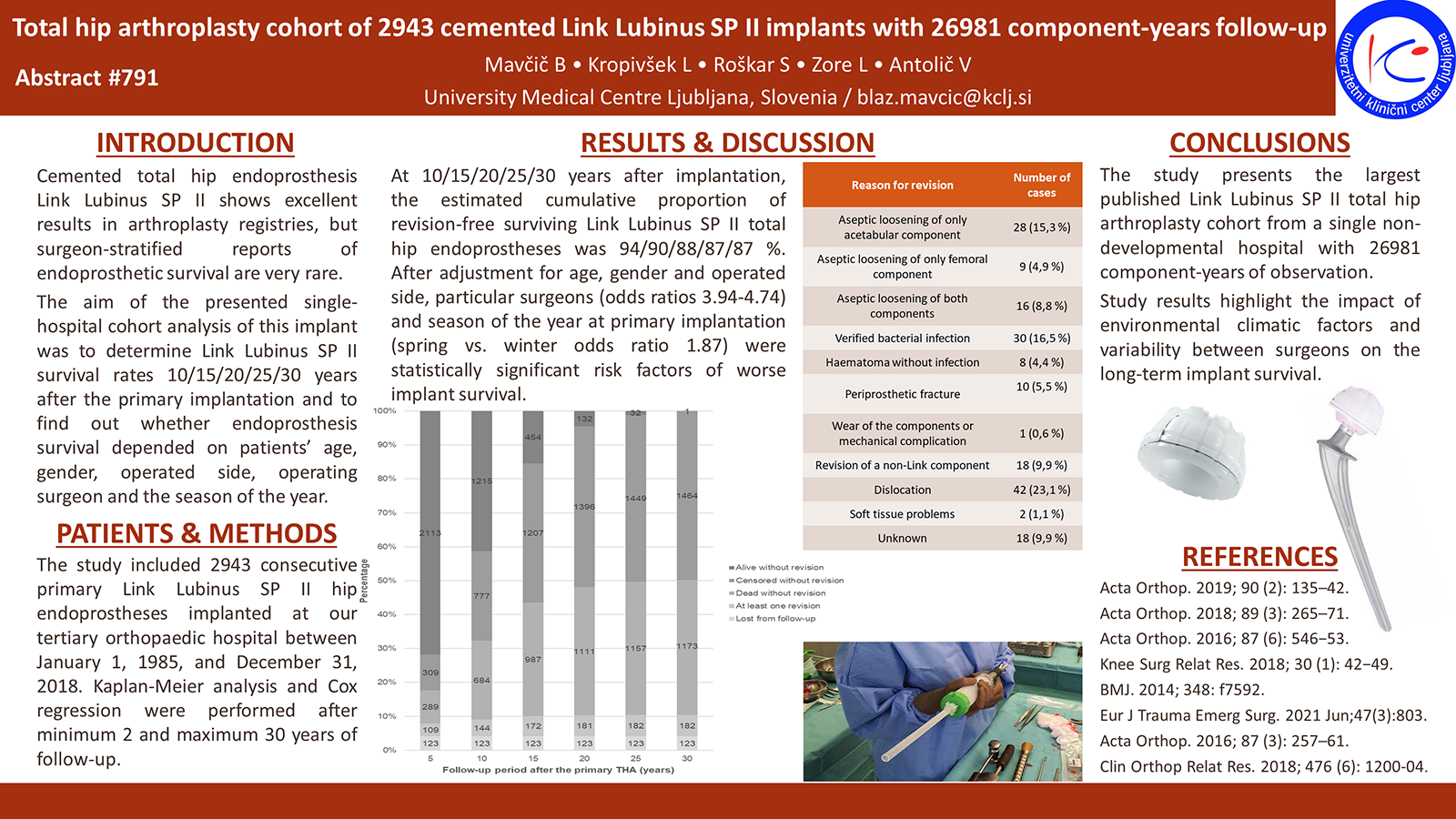 Introduction: Cemented total hip endoprosthesis Link Lubinus SP II has been used for decades with excellent results in arthroplasty registries, but surgeon-stratified reports of endoprosthetic survival are very rare. The aim of the presented single-hospital cohort analysis of this implant was to determine Link Lubinus SP II survival rates 10/15/20/25/30 years after the primary implantation and to find out whether endoprosthesis survival depended on patients’ age, gender, operated side, operating surgeon and the season of the year. Methods: The study included 2943 consecutive primary Link Lubinus SP II hip endoprostheses implanted at the University Medical Centre Ljubljana, Department of Orthopaedic Surgery (Ljubljana, Slovenia) between January 1, 1985 and December 31, 2018. Kaplan-Meier analysis and Cox regression were performed after minimum 2 and maximum 30 years of follow-up. Results: At 10/15/20/25/30 years after implantation, the estimated cumulative proportion of revision-free surviving Link Lubinus SP II total hip endoprostheses was 94/90/88/87/87 % and the cumulative proportion with unremoved immobile components was 96/93/90/89/89 %, respectively. After adjustment for age, gender and operated side, particular surgeons (odds ratios 3.94-4.74) and season of the year at primary implantation (spring vs. winter odds ratio 1.87) were statistically significant risk factors of worse implant survival. Conclusion: The study presents the largest published Link Lubinus SP II total hip arthroplasty cohort from a single non-developmental hospital with 26981 component-years of observation. Study results highlight the impact of environmental climatic factors and variability between surgeons on the long-term implant survival.