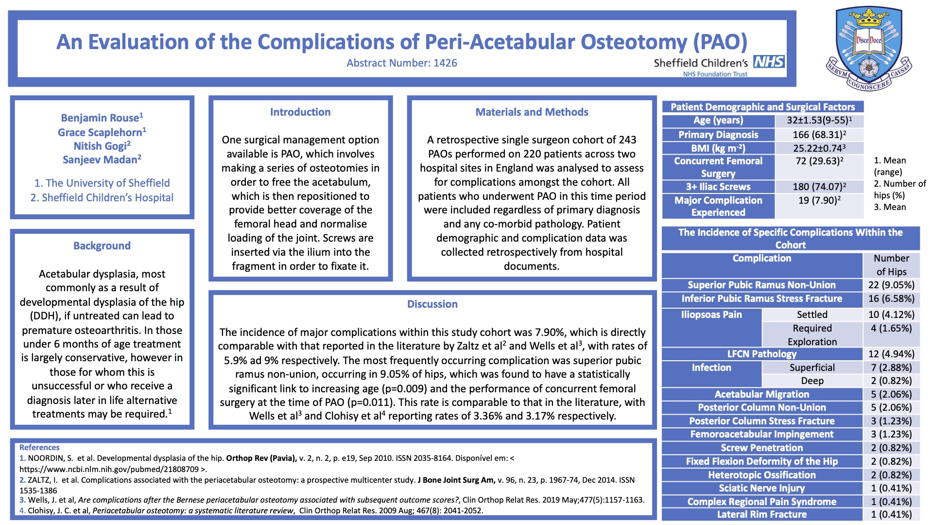 A retrospective single surgeon cohort of 243 PAOs were performed on 220 patients between 2006 and 2020 across 2 hospital sites in England. There was a mean follow up of 63.8±3.9 months (8-169 months) and post-surgical complications were assessed throughout this period. Peri-operative blood results were available for 225 hips. There was a female predominance of 74.4% within the cohort and 56.6% of PAOs were performed on the right side, with 68.7% being undertaken via a minimally invasive approach. The majority of patients had a primary diagnosis of developmental dysplasia of the hip (68.6%) followed by Perthe’s disease (9.5%), with a mean age of 26.4±1.5 years (9-55 years) at the time of surgery. The most commonly occurring complications were superior pubic ramus non-union (9.1%), pain (7.4%) and inferior pubic ramus stress fracture (6.6%). 5 hips experienced posterior column non-union and 3 had posterior column stress fracture with 2 requiring plating. 14 required iliopsoas injection (5.8%), two needing iliopsoas exploration. 4.9% had lateral femoral cutaneous nerve symptoms and there was one incidence of sciatic nerve palsy in a revision PAO. 5 patients had acetabular migration, two of whom required revision. There was a mean peri-operative decrease in blood haemoglobin concentrations of 3.8±0.4g/dL for the 225 available, and 9 patients (3.7%) required a post-operative blood transfusion. No complications above grade III were recorded. The results are similar to that reported in the literature and show that PAO is a complex and effective treatment for acetabular dysplasia, with significant complications.
