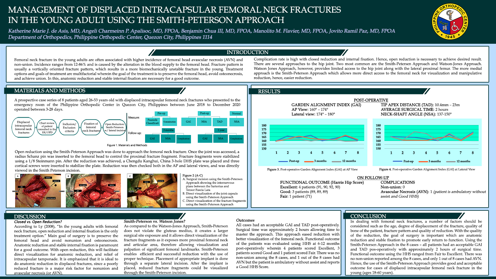 Management for femoral neck fractures are multifactorial; however, in the young active adult, the goal is to preserve the femoral head, avoid osteonecrosis, and achieve union. Good visualization of the fracture is needed to achieve anatomic reduction to improve outcome. From June 2018 to December 2020, eight patients aged 26-53 years old, diagnosed with displaced intracapsular femoral neck fractures were operated between 4 and 28 days from injury. Open reduction was done using the Smith-Peterson Approach. After reduction, a pin was inserted from the greater trochanter to the femoral head to the acetabulum, to stabilize the fracture fragments and prevent rotation. A separate lateral incision was made to fix the fracture using a Dynamic Hip Screw. Post-operatively, measurement of the Garden Alignment Index ranged from 160°–174° in the anteroposterior radiograph, and 174°–180° in the lateral radiograph. Average surgical time was 2 hours. Functional outcome of the patients was evaluated using Harris Hip Score (HHS) at 6-12 months post-operatively wherein four patients scored Excellent, two patients scored Good and one patient scored Fair. Non-union was not observed and one patient had stage II avascular necrosis of the femoral head but is ambulatory with Good HHS and without any assistive device. Thus, Smith-Peterson Approach creates a larger surgical site exposure and allows direct access to the femoral neck for better visualization and easier reduction, as compared to Watson-Jones Approach. Through the Smith-Peterson Approach, a more anatomic reduction and stable fixation can be achieved that promotes earlier return to function.