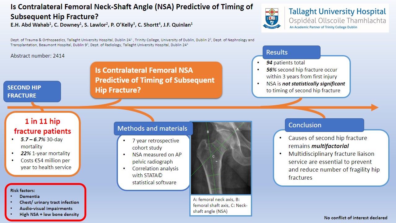 Introduction: In 2019, research showed that in the six acute adult Dublin hospitals, 1 in 11 patients with fragility hip fracture sustained a second contralateral hip fracture. These have implications of additional patient morbidity and cost to the Health Service. Relationship of the contralateral femoral neck-shaft angle and timing to the second hip fracture have not been established previously. Methods: A single hospital, retrospective study from 2013 to 2019 was undertaken to assess the contralateral neck-shaft angle (NSA) to predict the time to second hip fracture. NSA of 94 patients with second hip fracture were measured from pelvic radiographs and time to second fracture were analysed. Measurements were taken by two members of the research team, using a standardised measurement technique. Results: NSA ranges from 113.0 to 146.5 degrees, with an average of 130.2 degrees. Average time to second hip fracture was 3.5 years, ranging from 0.08 year (29 days) to 20 years (7326 days). 56% of second hip fractures occurred within 3 years of index fracture. No significant correlation was found between NSA and timing of second hip fracture. Discussion: We concluded that femoral NSA independently is not statistically significant in predicting the time in those patients that sustained a second hip fracture. Causes of secondary hip fracture are multifactorial and multidisciplinary fracture liaison services are essential to reduce the number of fragility fractures.