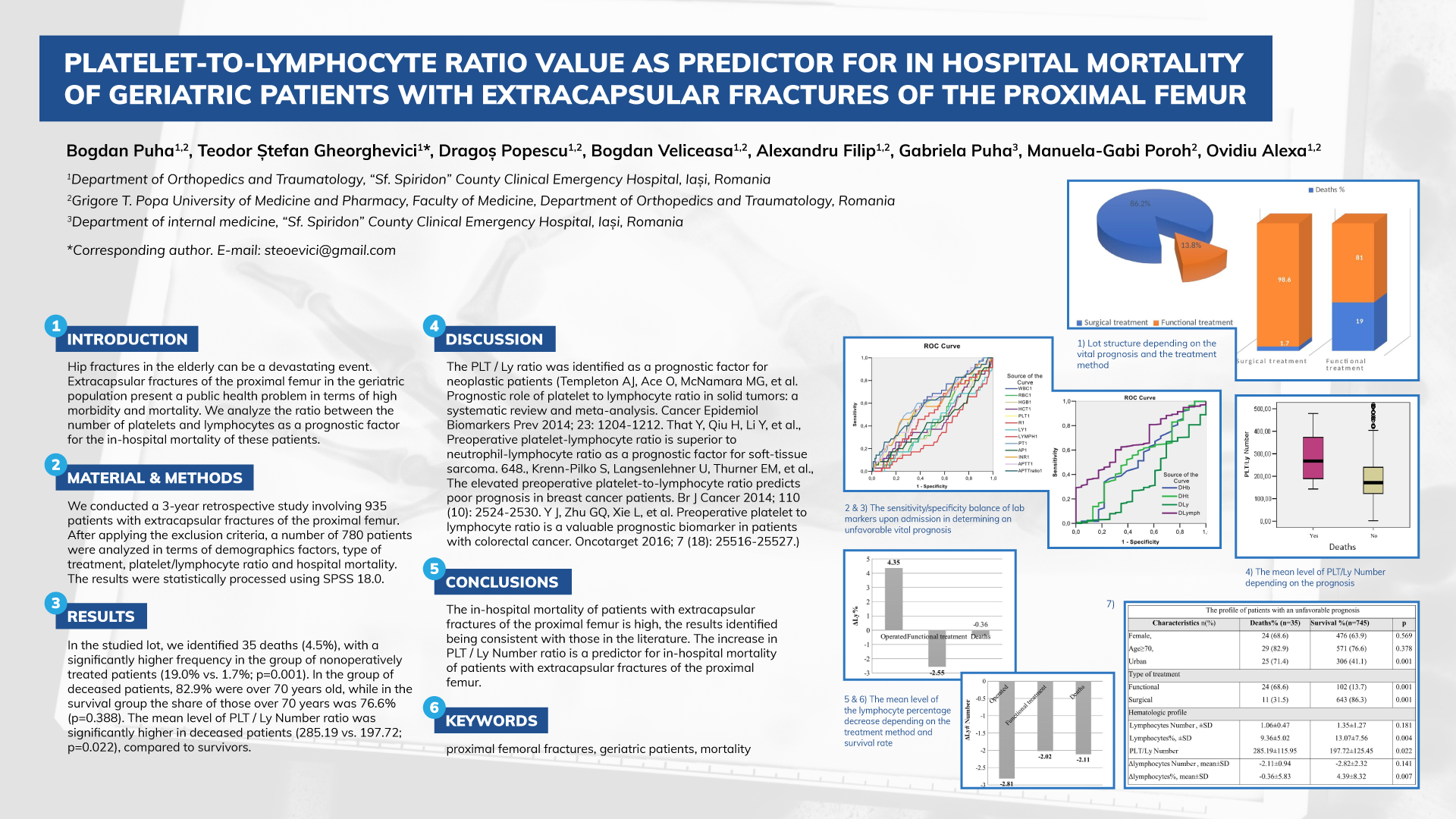 Introduction: Hip fractures in the elderly can be a devastating event. Extracapsular fractures of the proximal femur in the geriatric population present a public health problem in terms of high morbidity and mortality. We analyze the ratio between the number of platelets and lymphocytes as a prognostic factor for the in-hospital mortality of these patients. Material and methods: We conducted a 3-year retrospective study involving 935 patients with extracapsular fractures of the proximal femur. After applying the exclusion criteria, a number of 780 patients were analyzed in terms of demographic factors, type of treatment, platelet / lymphocyte ratio and hospital mortality. The results were statistically processed using SPSS 18.0. Results: In the studied lot, we identified 35 deaths (4.5%), with a significantly higher frequency in the group of nonoperatively treated patients (19.0% vs 1.7%; p = 0.001). In the group of deceased patients, 82.9% were over 70 years old, while in the survival group the share of those over 70 years old was 76.6% (p = 0.388). The mean level of PLT / Ly # ratio was significantly higher in deceased patients (285.19 vs 197.72; p = 0.022). Conclusions: The in-hospital mortality of patients with extracapsular fractures of the proximal femur is high, the results identified being consistent with those in the literature. The increase in PLT / Ly # ratio is a predictor for in-hospital mortality of patients with extracapsular fractures of the proximal femur. Keywords: proximal femoral fractures, geriatric patients, mortality
