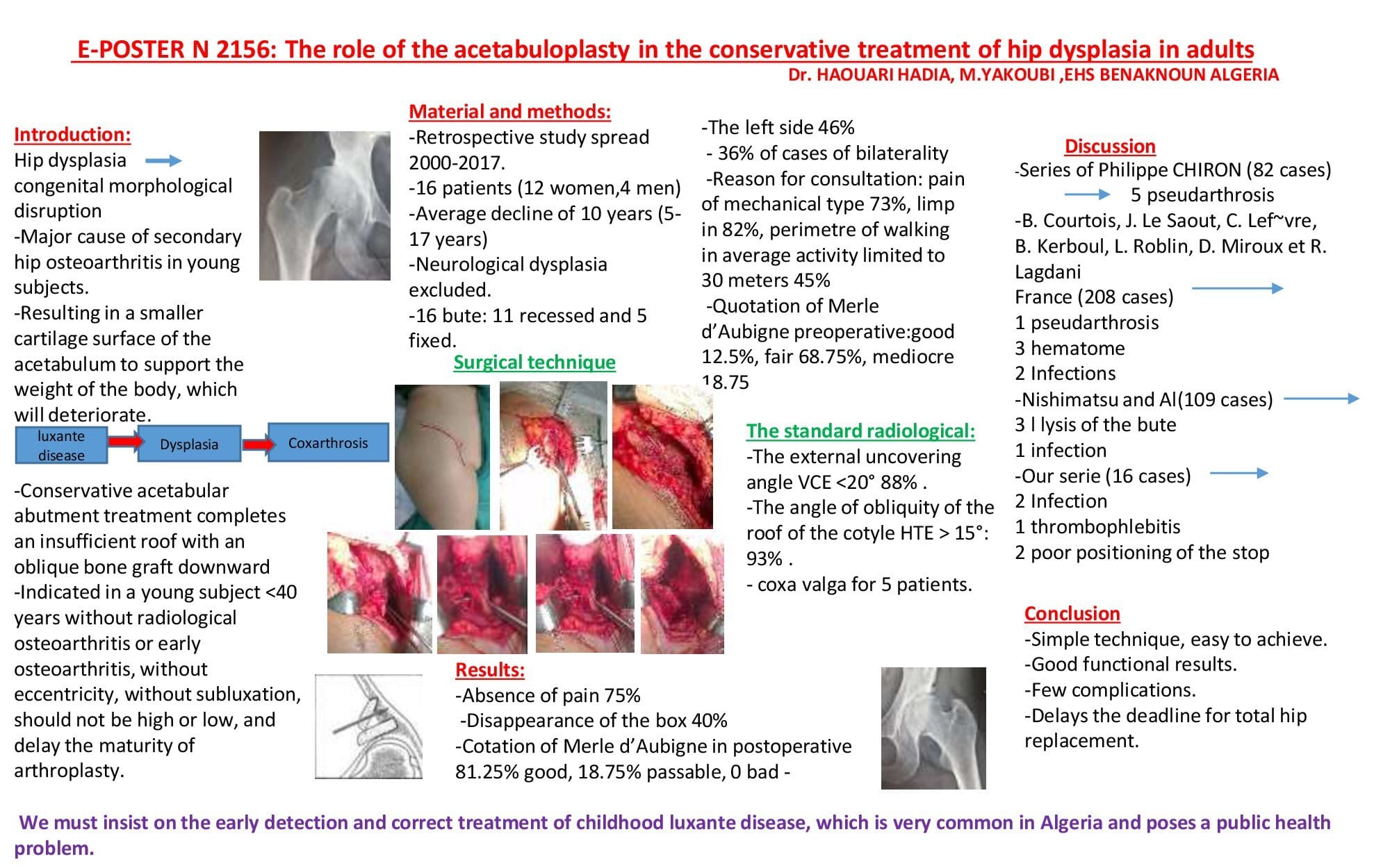 Introduction:Hip dysplasia is a congenital morphological disruption of the hip joint,it is a major cause of secondary hip osteoarthritis in young subjects. The most common are acetabular dysplasias which present a problem with stripping,resulting in a smaller cartilage surface of the acetabulum to support the weight of the body,which will deteriorate.Conservative acetabular abutment treatment completes an insufficient roof with an oblique bone graft downward,outward and forward in order to increase the contact surface and decrease the unit pressure on the femoral head. Indicated in a young subject <40 years without radiological osteoarthritis or early osteoarthritis, without eccentricity, without subluxation, should not be high or low, and delay the maturity of arthroplasty. Material and method:Our series includes a retrospective study going between 2000 and 2013, of 16 patients (12 women and 4 men), with an average age of 31 years,and an average follow-up of 10 years, all our patients were treated by acetabular stopper including 11 embedded and 4 fixed by screws. Results:Functionally, there was a clear improvement in pain and lameness,with 90% of patients very satisfied,Merle d'Aubigné's rating went from fair (12-13) to good (15-16).noted one case of superficial sepsis and one case of thrombophlebitis without late complications.Discussion:Our results match those of the literature with few complications,and a clear satisfaction of our patients.The action of the acetabular stopper on pain and preservation of the hip has been reported by several authors.Conclusion:The acetabulum is a simple technique, easy to perform, giving encouraging functional results, and which delays the deadline for arthroplasty.