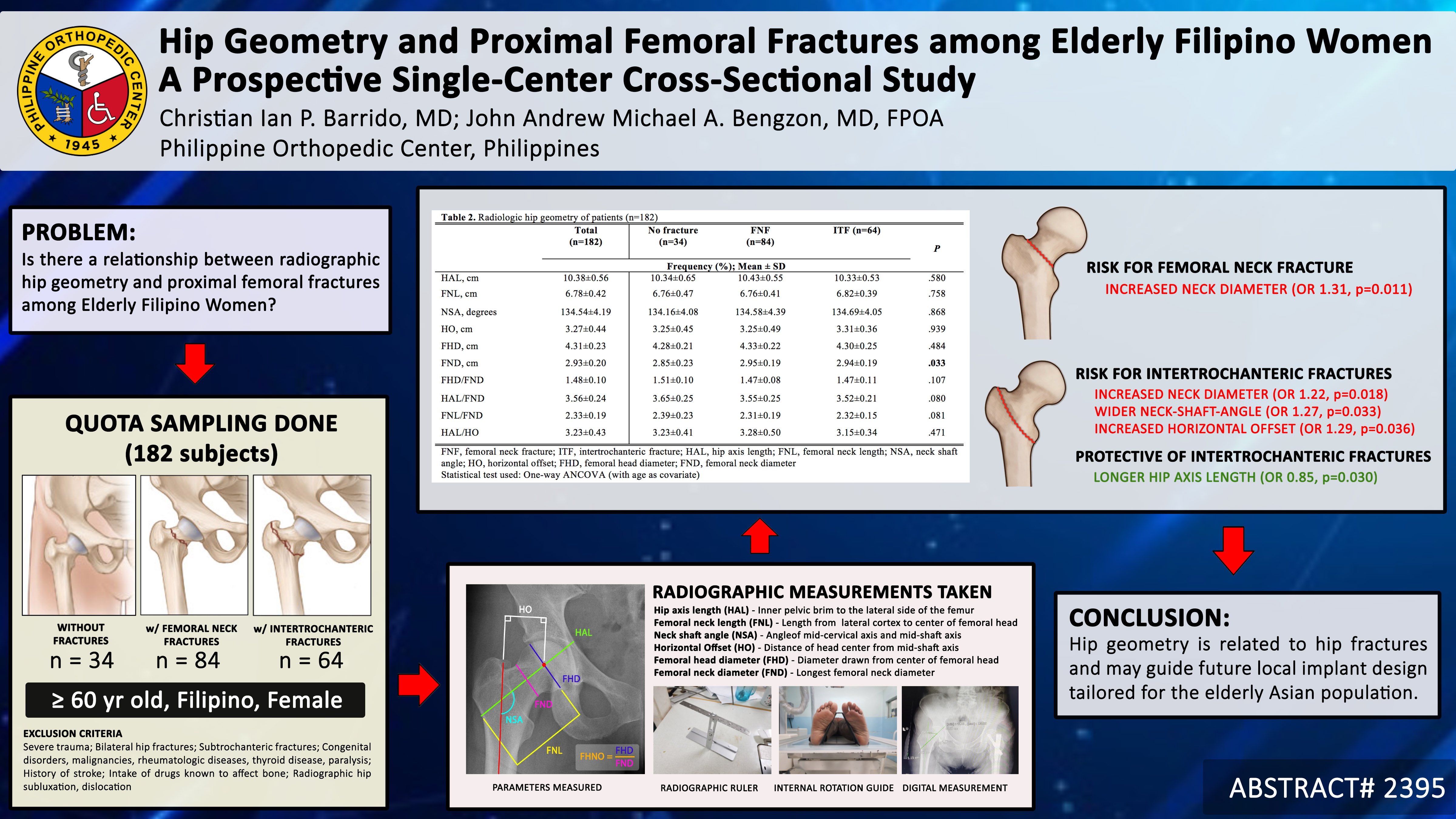 INTRODUCTION: Few controlled studies explore proximal femoral geometry and risk for acquiring proximal femoral fractures, especially among the elderly. Previous reports still reveal multiple inconsistencies. OBJECTIVE: To establish if there is an association between radiographic hip geometry and risk for proximal femoral fractures based on measurements taken from elderly Filipino women. METHODS: A prospective, cross-sectional study of 182 Filipino women ≥ 60 years old at a single orthopedic institution last 2019-2020 was done. Patients were categorized into those with femoral neck fractures (n=84), intertrochanteric fractures (n=64), and those without diagnosed hip fractures (n=34). Standard pelvic radiographs done and the following radiographic parameters were compared: hip axis length (HAL), femoral neck length (FNL), neck shaft angle (NSA), horizontal offset (HO), femoral head diameter (FHD), and femoral neck diameter (FND). RESULTS: Data suggests increased FND increased the risk for acquiring both femoral neck (OR = 1.31, p = .011) and intertrochanteric fractures (OR: 1.22, p = 0.018). For intertrochanteric fractures alone, a wider NSA (OR 1.27, p = 0.033) and larger HO (OR 1.29, p = 0.036) increased the risk for this fracture type while a longer HAL was protective (OR 0.85, p = 0.30). Other recorded parameters revealed no correlation. CONCLUSION: Results show that hip geometry plays a role in the risk and incidence of developing femoral neck or intertrochanteric fractures. These measurements may aid in identification of patients at risk for fractures, act as a guide for implant design, and increase accuracy of hip reconstruction among the elderly population.